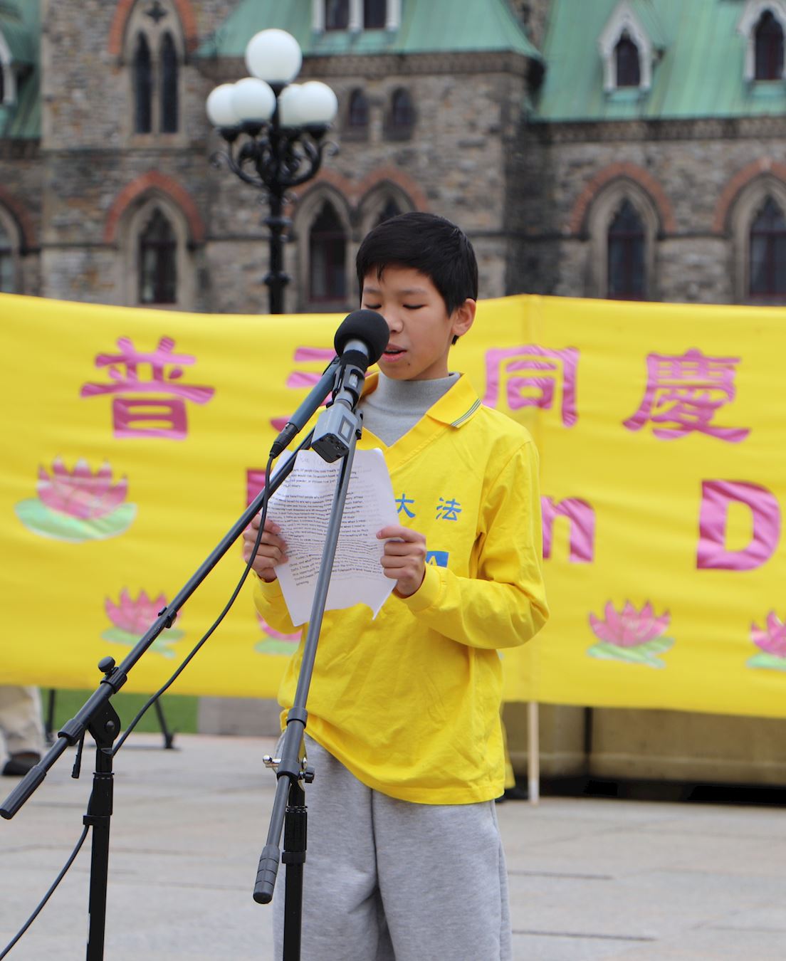 在集会上,二位十三岁的法轮功学员发言分享了他们修炼大法后身心受益的体会。