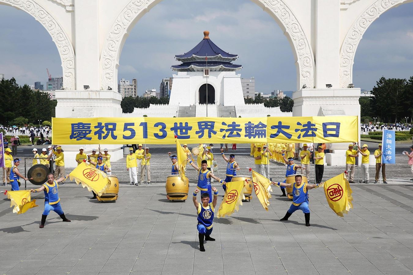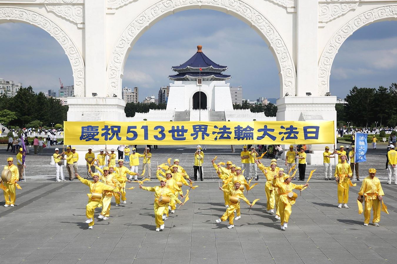 这天,来自北台湾近千名法轮功学员齐聚台北自由广场,透过乐器演奏与五套功法展示,振奋欢庆的乐声和祥和宁静的功法演示,交织成一道独特的亮黄色风景线,吸引市民和游客的目光驻足观看、摄影拍照。