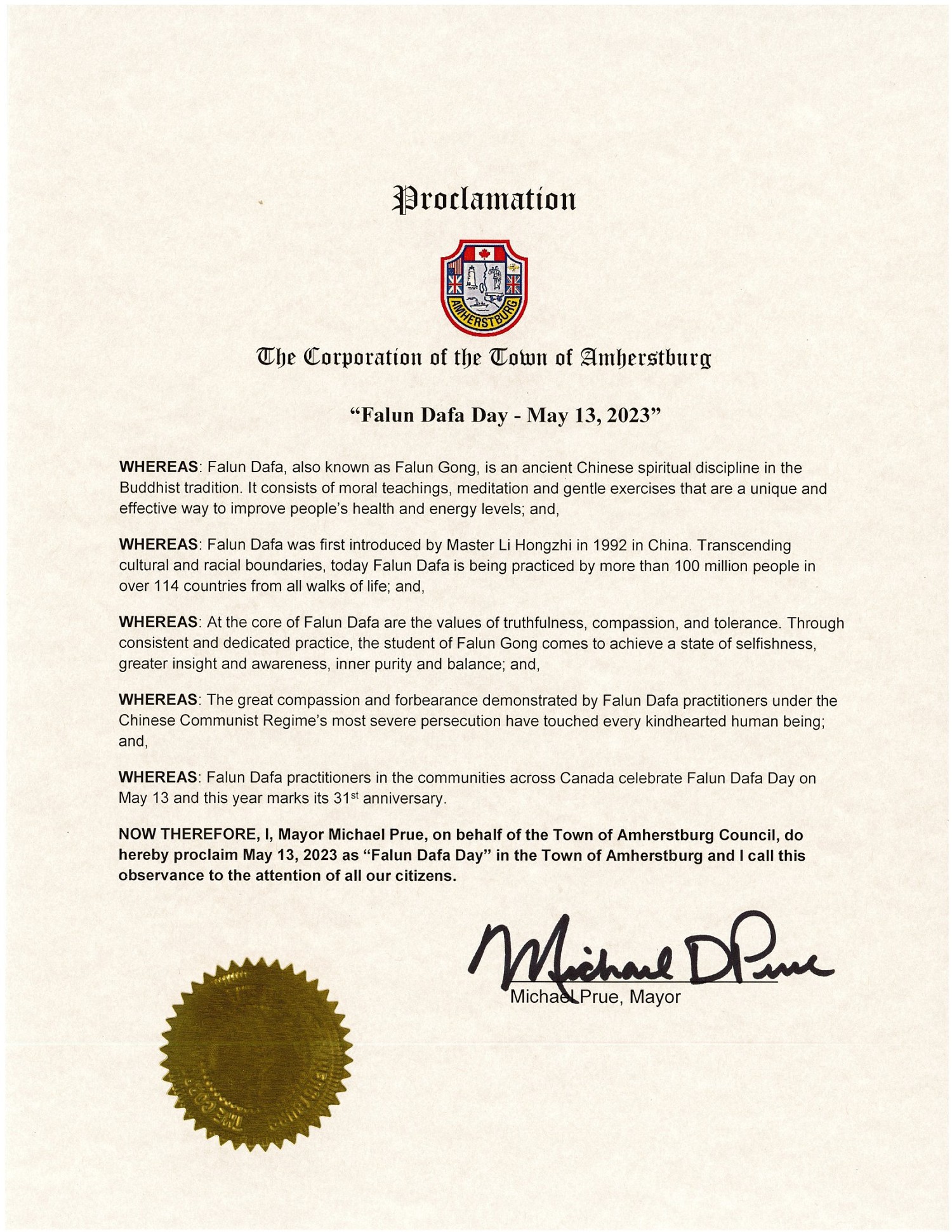 我,市长迈克尔·普鲁(Michael Prue)代表阿默斯特堡镇议会,特此宣布二零二三年五月十三日为阿默斯特堡镇的“法轮大法日”。 我呼吁所有公民关注、参与庆祝活动。”