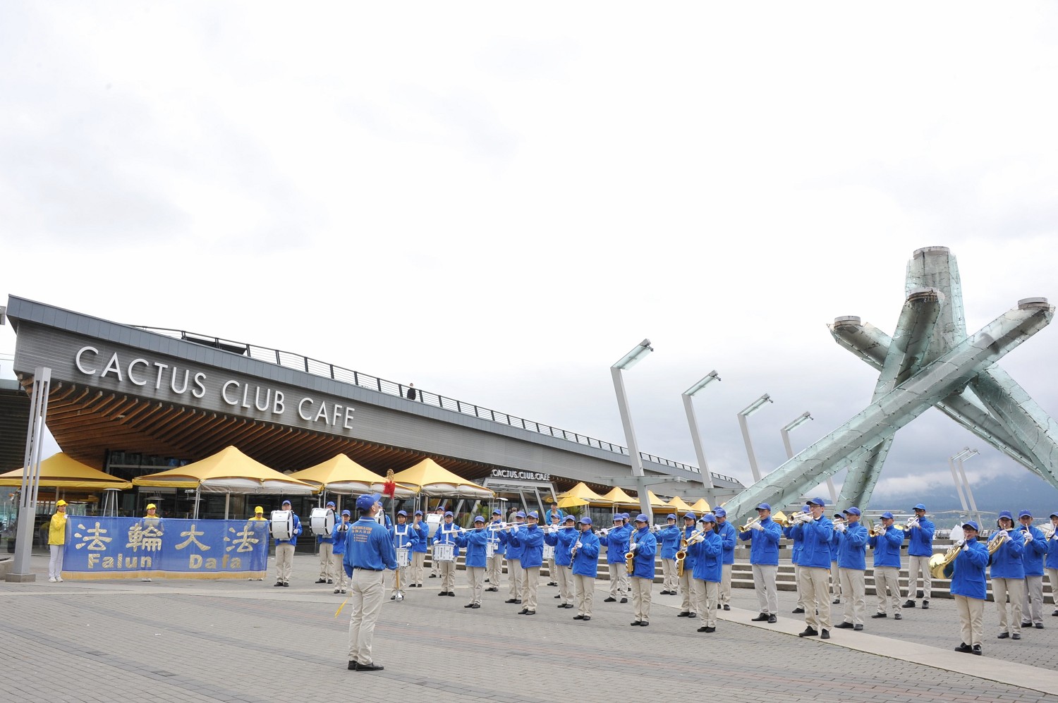 图1~3:二零二三年五月六日,温哥华地区部分法轮功学员集会在温哥华会展中心火炬广场(Jack Poole Plaza)举行,天国乐团、腰鼓队在庆祝法轮大法日活动中演出。