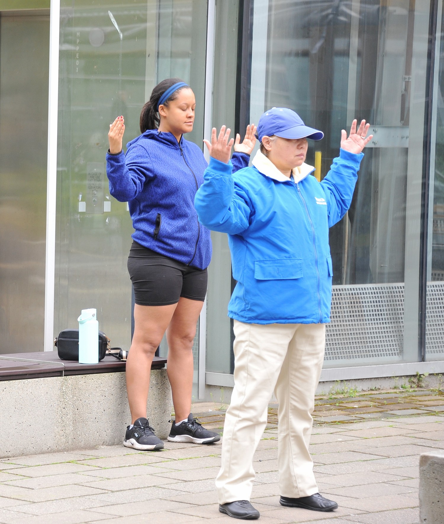 图11:温哥华居民埃斯塔西娅-桑德斯(Ecstasia Sanders)(左),随着炼功音乐也跟着炼功。