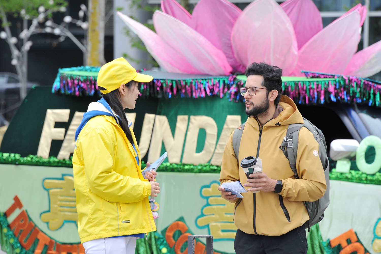 图12~13:民众被游行队伍所吸引,正在向法轮功学员了解详情。