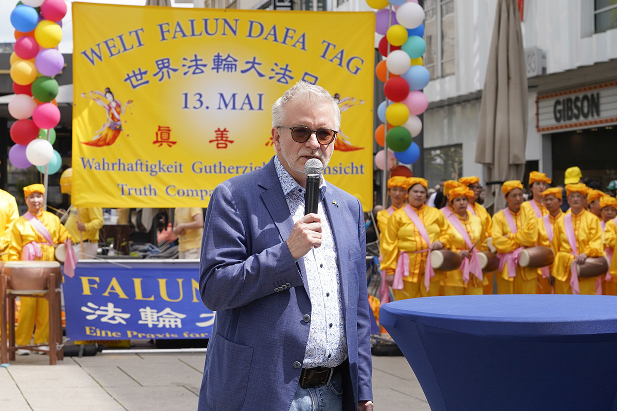 二零二三年五月六日,法轮功学员在德国金融中心法兰克福繁华购物区采尔大街(Zeil)举行活动,庆祝五•一三世界法轮大法日,暨法轮功创始人李洪志先生华诞。欧盟议会议员米歇尔·戛勒(Michael Gahler)到场祝贺。