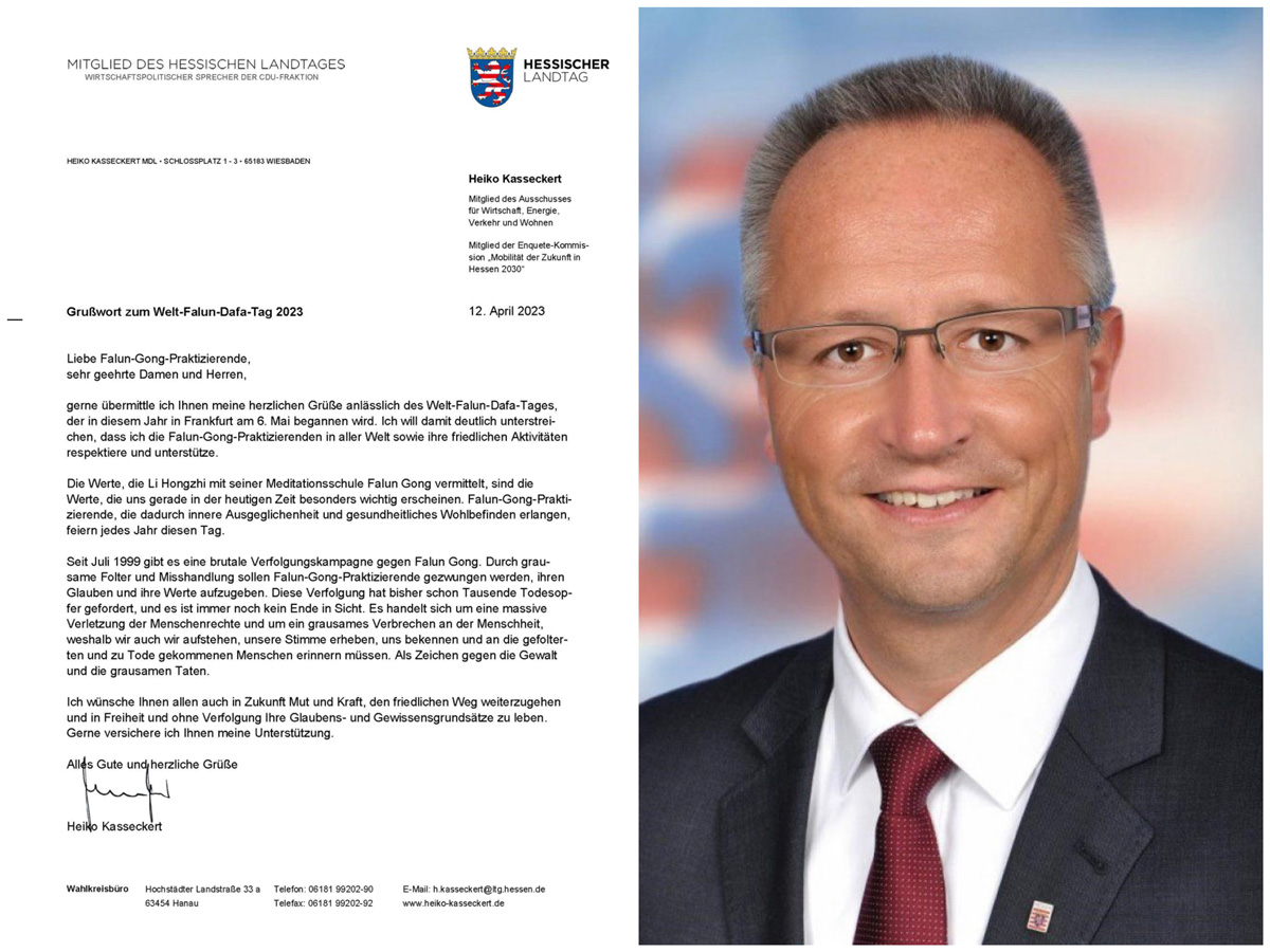 黑森州议会基民盟(CDU)议员海科·卡塞克特(Heiko Kasseckert)发贺信,衷心地向世界法轮大法日活动致以节日的问候。他在贺信中说:“李洪志先生通过法轮功修炼法门所传授的价值观,尤其在当今对我们来说特别重要。法轮功学员由此获得了内心的平衡和健康,每年都会庆祝这个日子。”