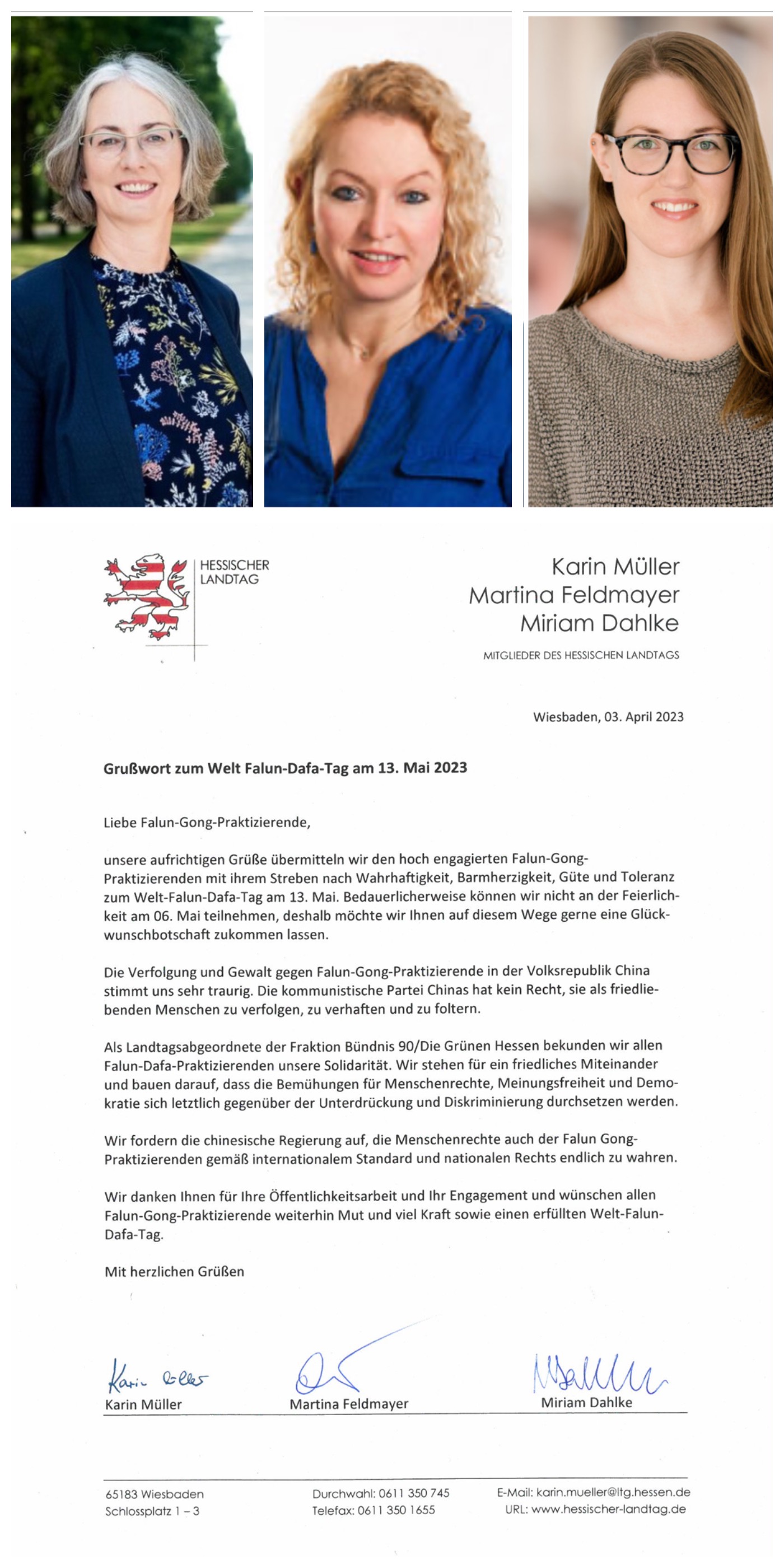 ![]() 图5:黑森州议会副议长卡琳·米勒(Karin Müller,左)和两位绿党副主席马婷娜·费尔德迈尔(Matina Feldmayer,中),米莉亚·达尔克(Miriam Dahlke,右)联名发贺信,祝愿所有法轮功学员继续保持勇气和力量,度过一个圆满的世界法轮大法日。 |