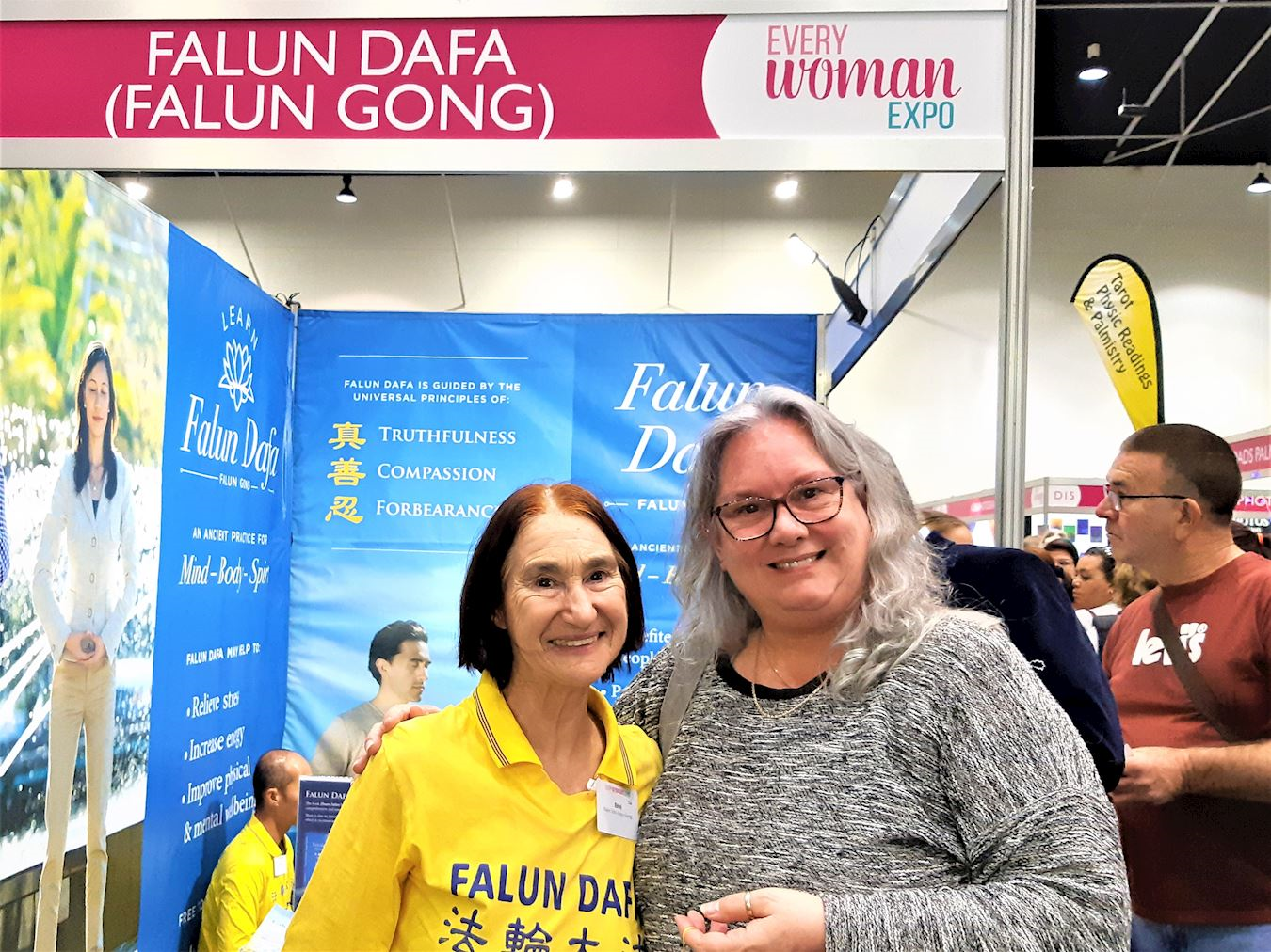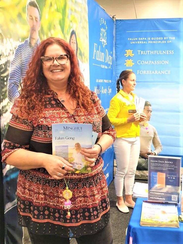玛吉·罗文(Maggie Rowan)在展位上与一位越南裔法轮功学员交谈,并询问学炼法轮功的相关信息,她说:“我实际上非常感兴趣,我会给这位学员打电话,我想报名学炼。”