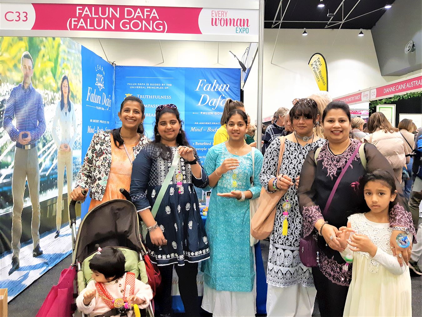 来自印度的阿尼卡·侯赛因(Aniqa Hussain和家人在法轮功展位前驻足观赏学员演示功法,并欣喜地接过真相资料和小莲花挂坠。
