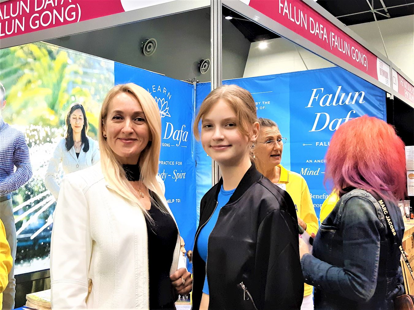 埃琳娜(Elena)和女儿来到展位前,埃琳娜说:“我之前没有听说过法轮功。所以很想来多了解一下。”