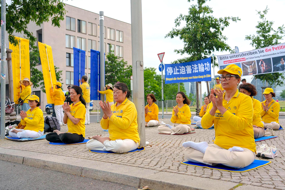 图1~2:二零二三年六月二十日上午,法轮功学员在柏林总理府对面进行和平抗争。