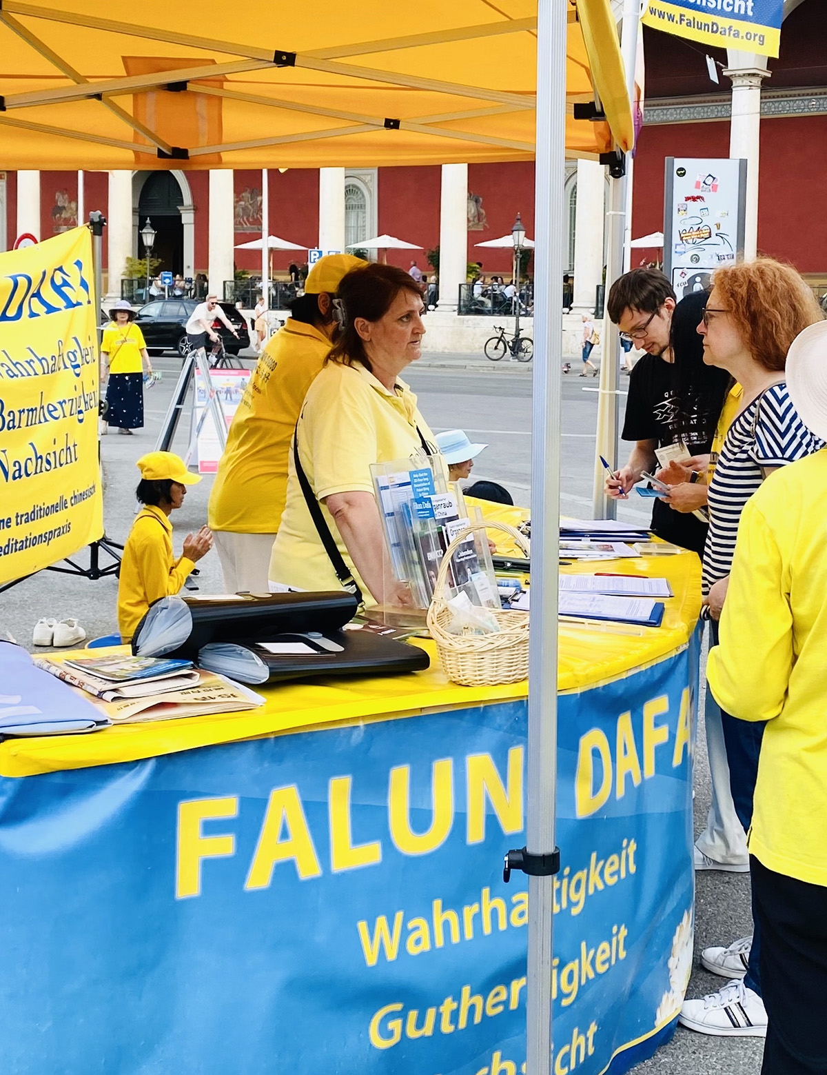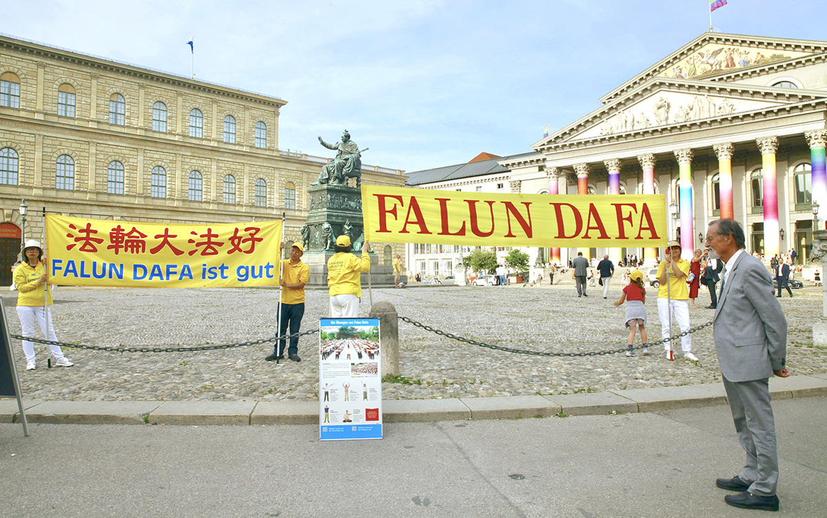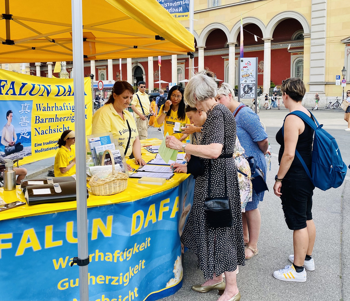 德国总理朔尔茨(Olaf Scholz)上午在德国首都柏林的总理府与李强会谈;傍晚,巴伐利亚州州长索德(Markus Söder)在首府慕尼黑所在地的慕尼黑王宫与李强会面。会谈期间,法轮功学员一直在德国总理府和慕尼黑王宫前的马克西-约瑟夫广场(Max-Joseph-Platz)进行和平抗争。一些过往的民众在了解了法轮功是什么,为什么中共要迫害法轮功,以及中共活摘法轮功学员器官的罪恶后,纷纷在签名簿上签名,声援法轮功学员反迫害。