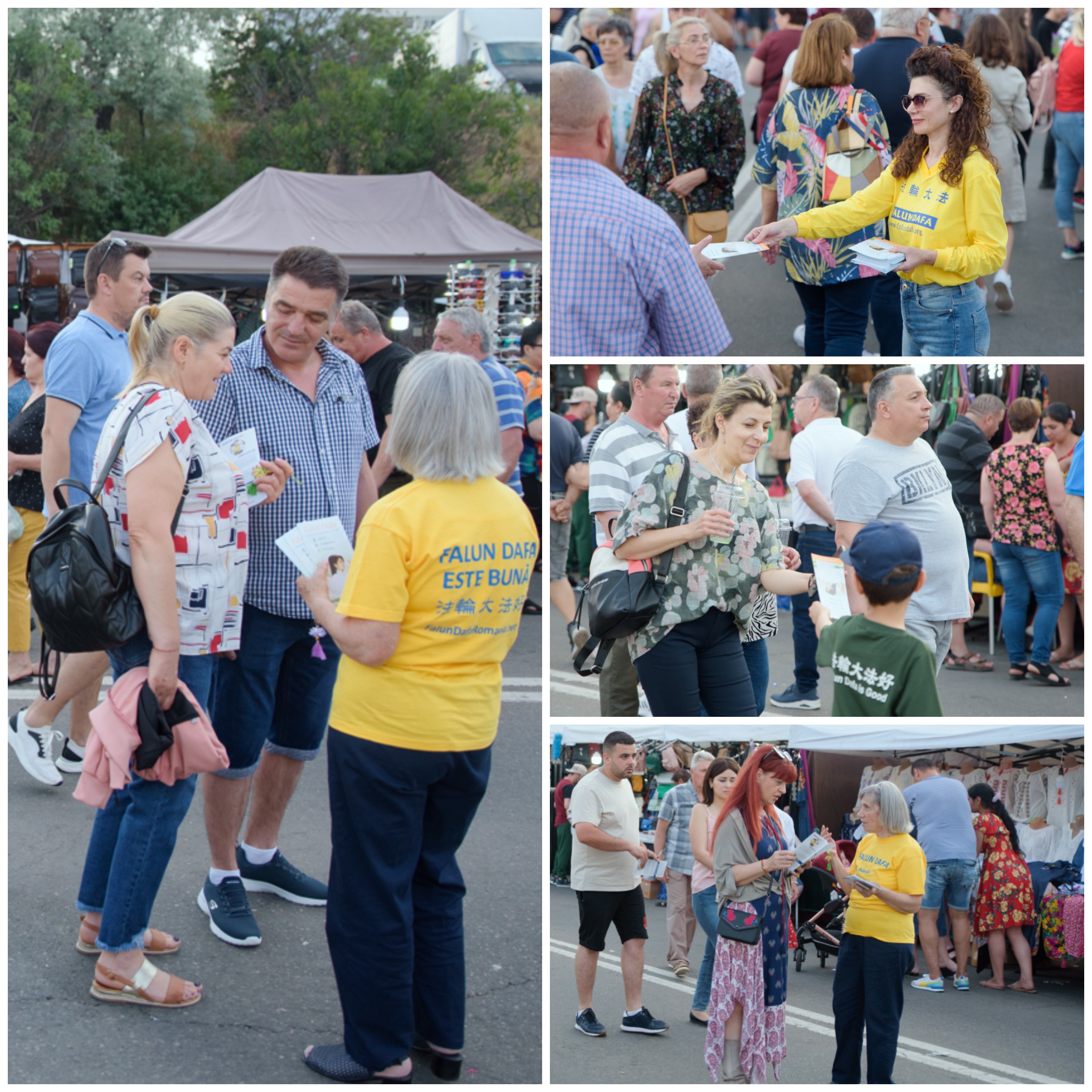 ![]() 图5~8:许多民众驻足了解法轮功真相,接过真相资料和精美的真相小莲花 |