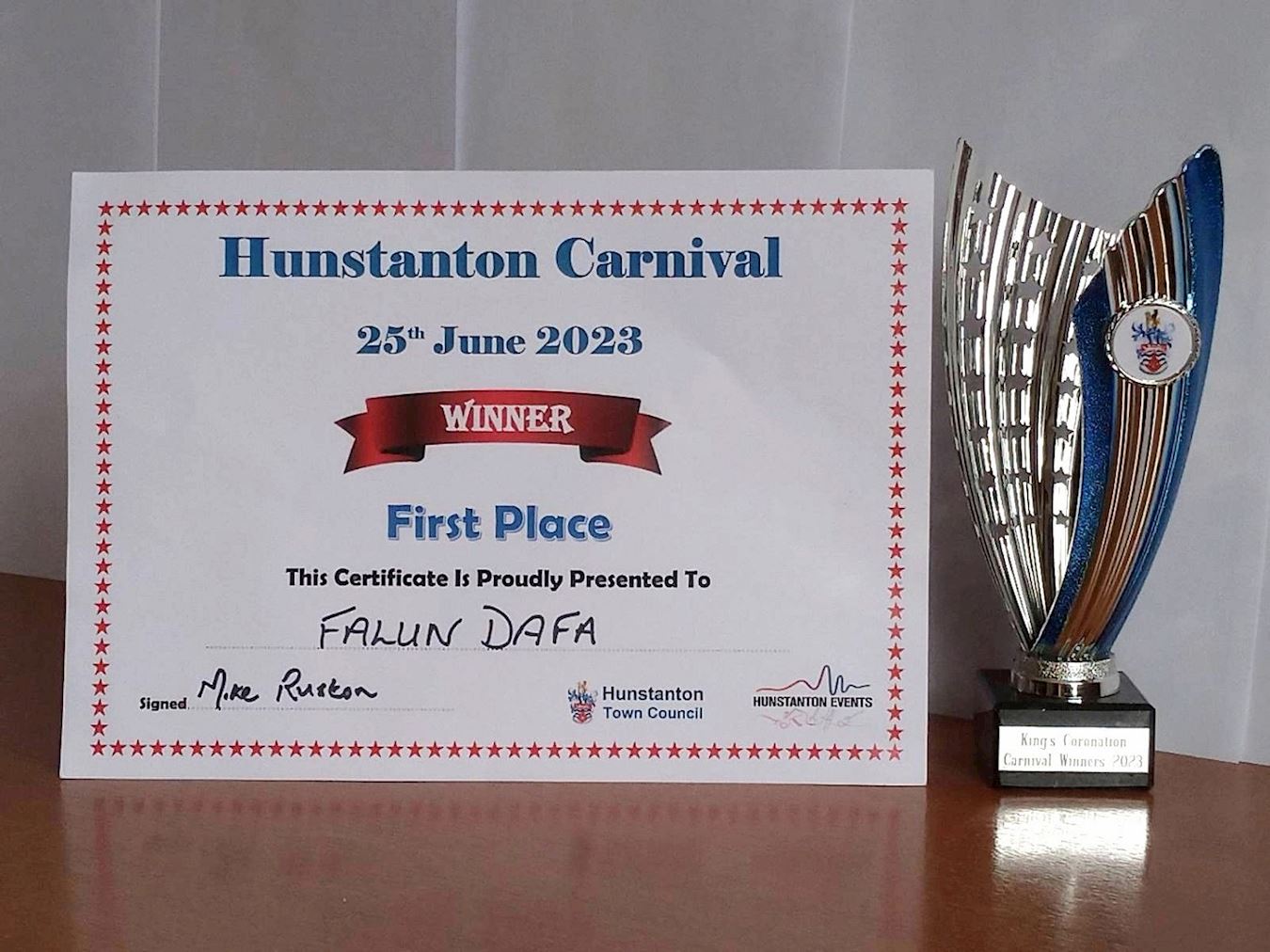 ![]() 图2:法轮功荣获英国亨斯坦顿庆典活动一等奖。 |
