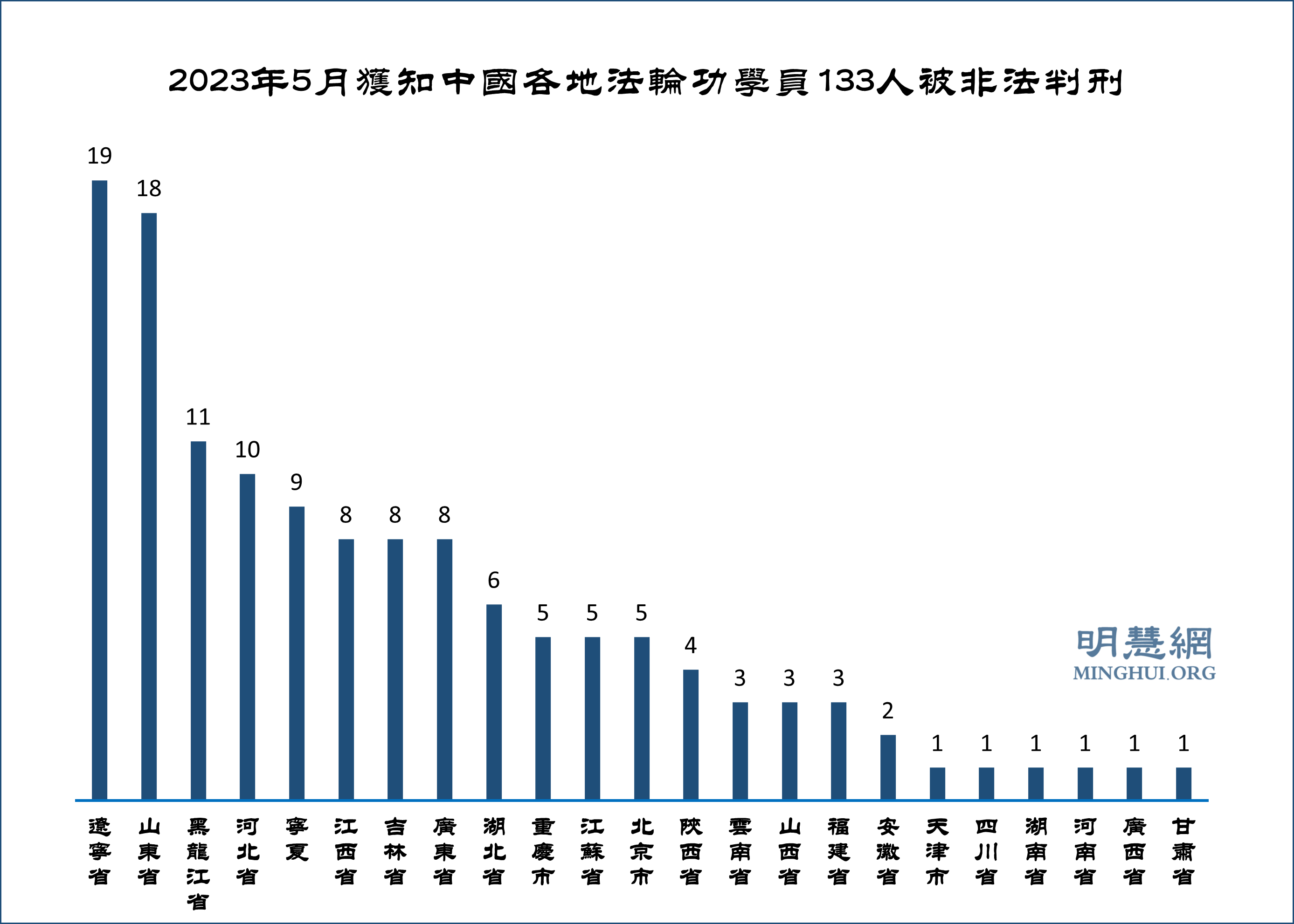 【明慧网二零二三年六月五日】(明慧网通讯员综合报道)据明慧网报道统计,二零二三年五月份获知,中国大陆有133名法轮功学员被非法判刑,分布于23个省、自治区、直辖市,其中有26名60岁以上的老年法轮功学员,最长者85岁。中共法院、公安警察敲诈勒索法轮功学员现金人民币666942元,美元6400元。