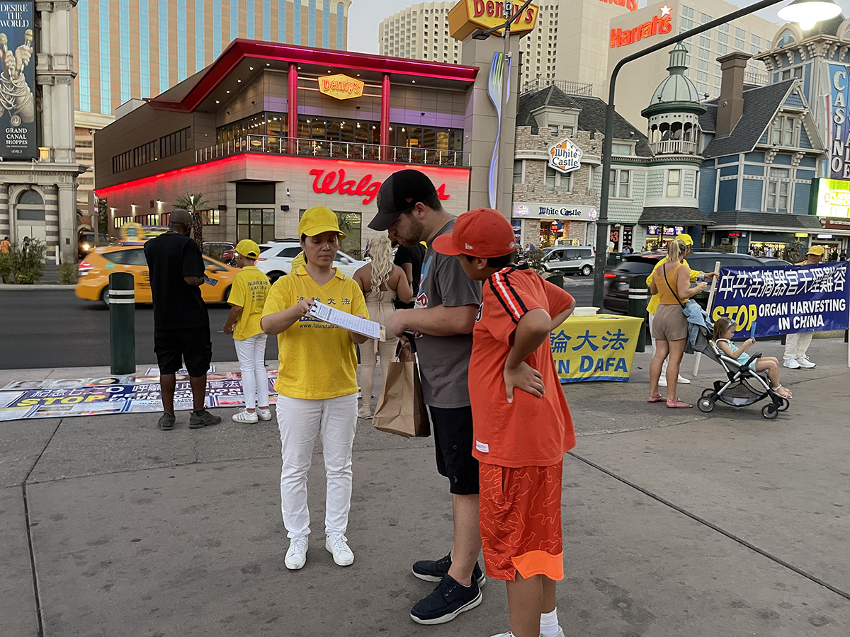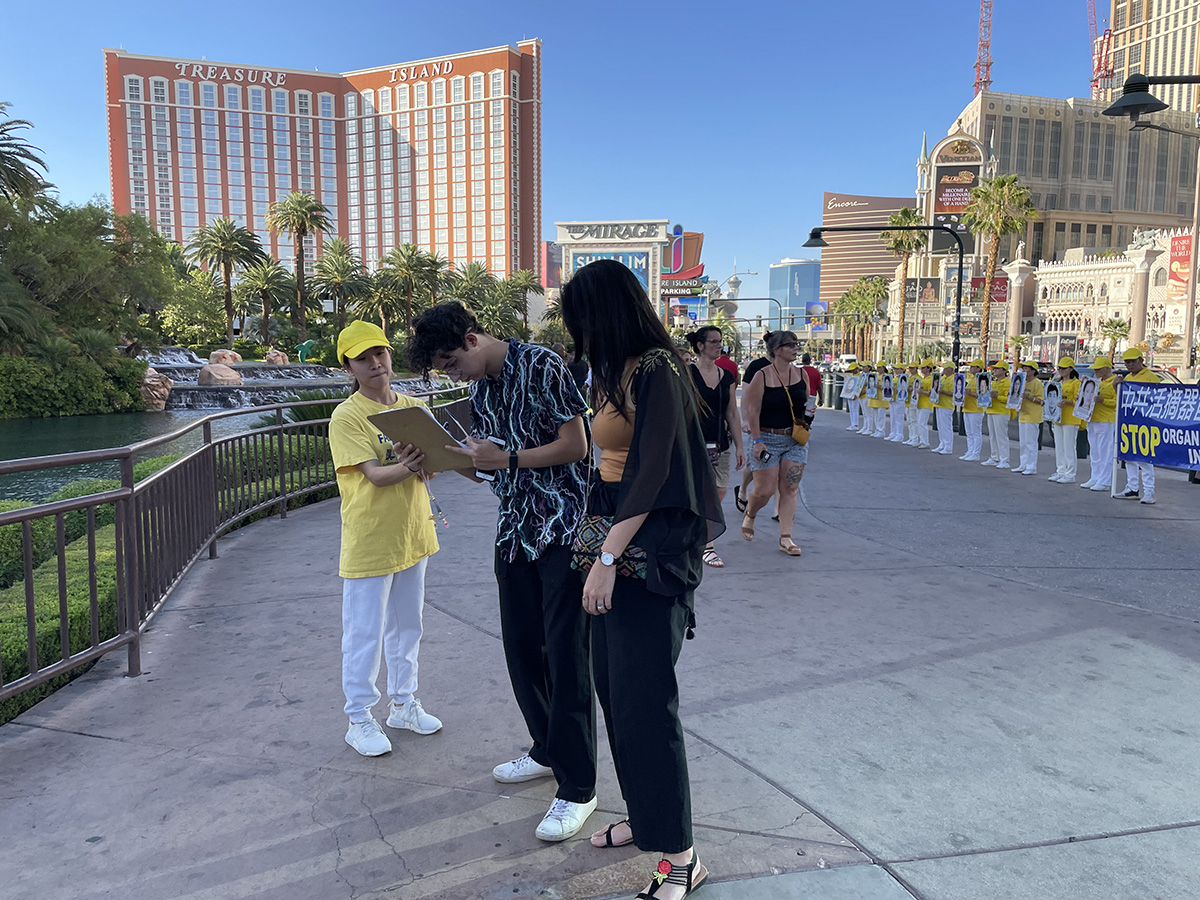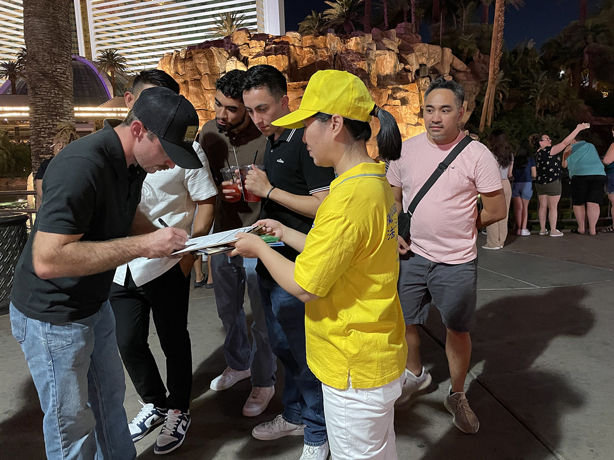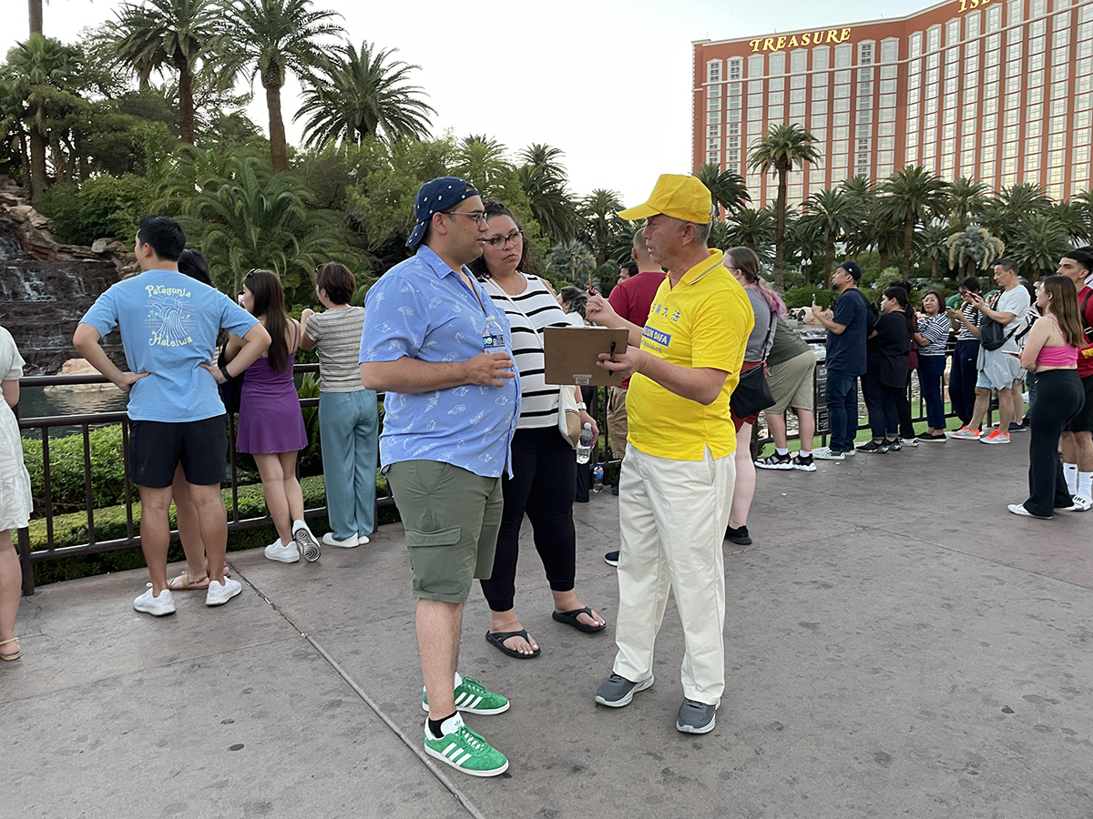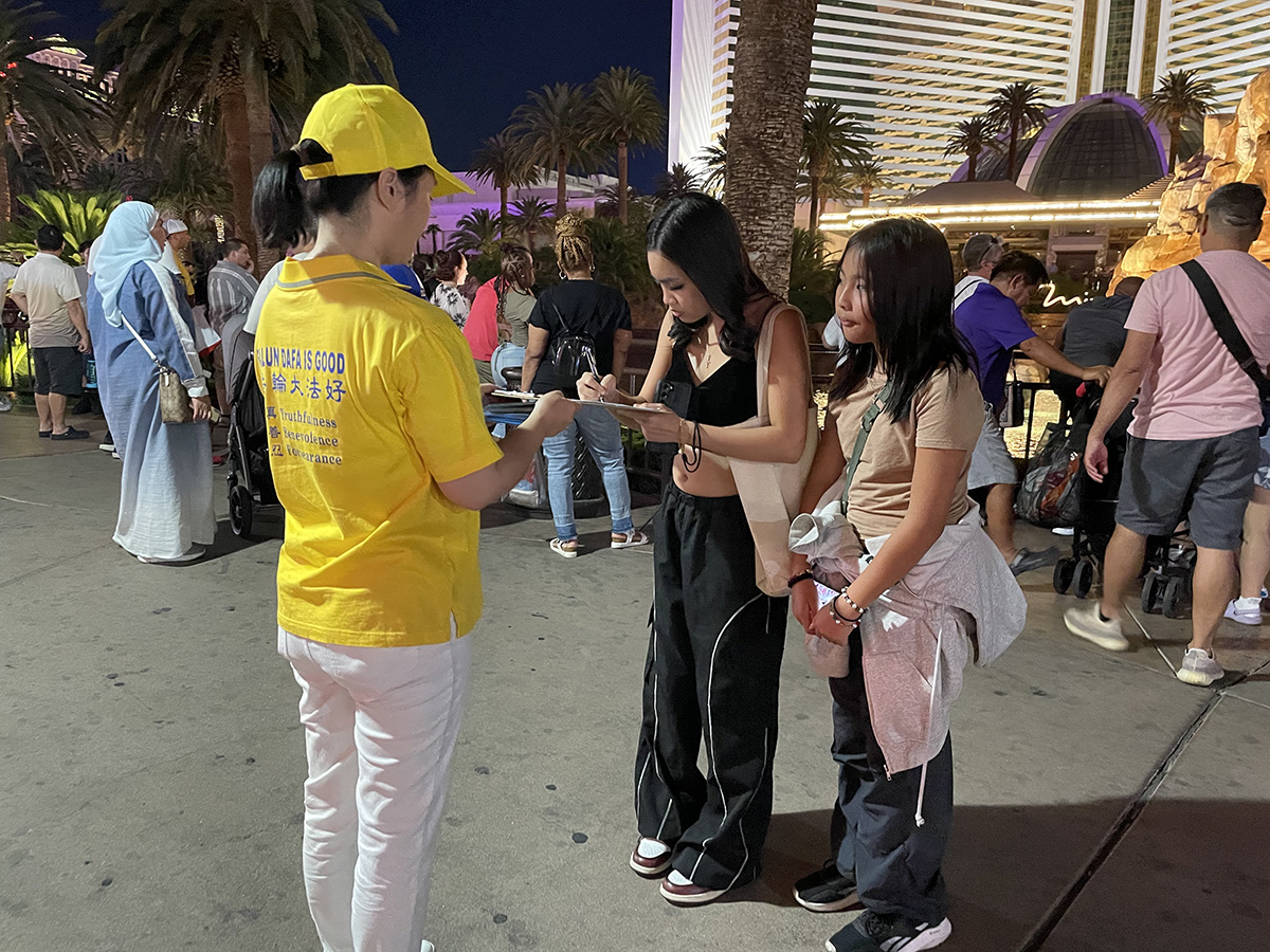 来自波士顿,在拉斯维加斯参加展会的一对西人夫妇接过学员派发的真相资料,愉快地在解体中共征签表上签名。