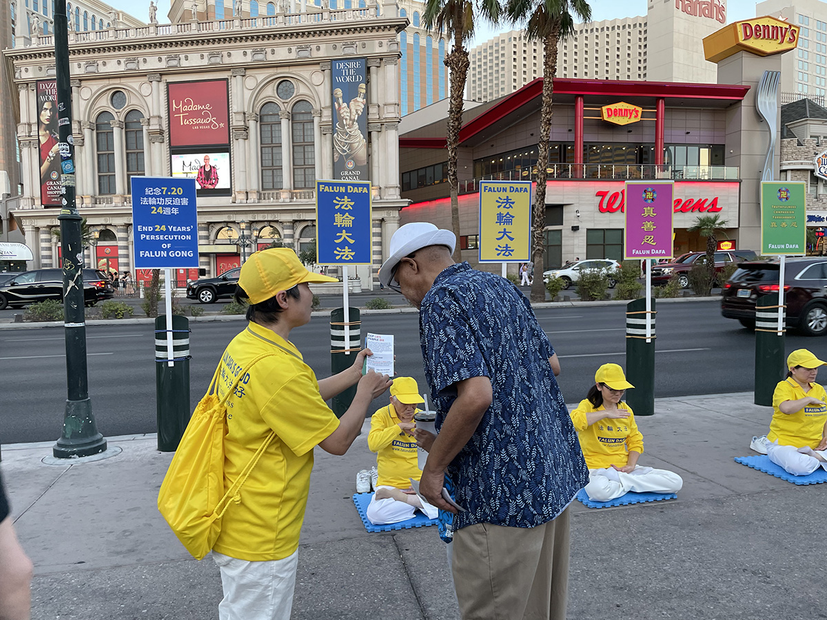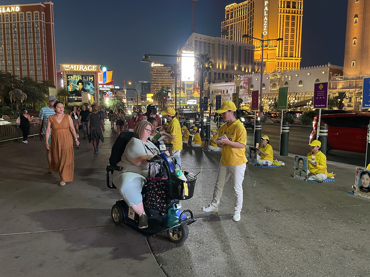当地居民罗伯特(Robert Campbell)是从事大型工程建设行业的,曾在海军服役七年。他晚上来赌场大道,看到了这个集会,非常认真地在征签表上签名,接受了学员赠送的小莲花。