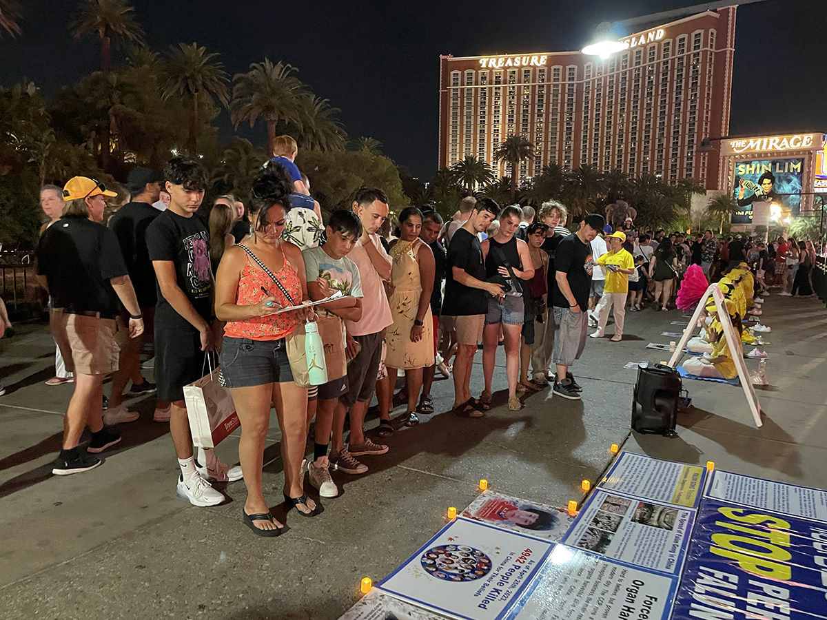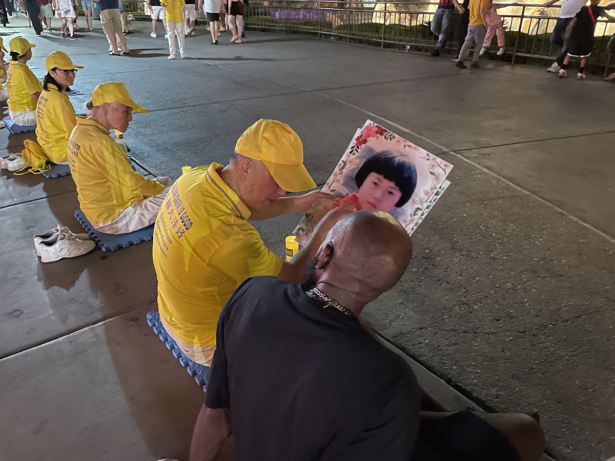 当天的系列活动包括集会、游行、功法展示和烛光夜悼四个环节。络绎不绝的游客和行人被现场庄重肃穆的气氛深深感染,纷纷停下脚步观看展板,接过法轮功学员派发的资料认真阅读,并在解体中共的征签表格上签名,表达对学员反迫害的同情和支持。