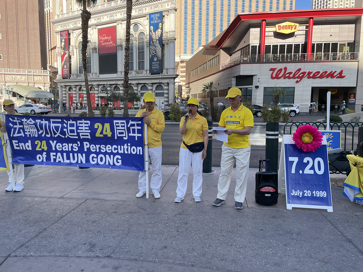 ![]() 图1:法轮功学员们在著名的赌场大道游行 |