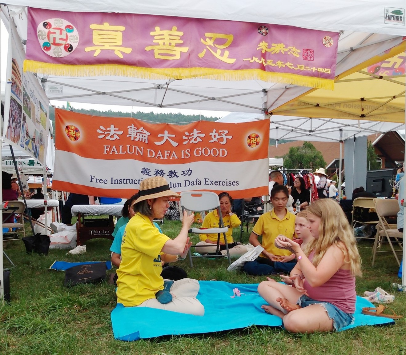 法轮功学员在平静祥和的炼功音乐声中展示五套功法,许多前来参加活动的人们经过展位时都会驻足观看,接过学员递来的法轮功真相传单。聆听学员对法轮功的介绍,以及中共对法轮功长达二十四年的残酷迫害的讯息。