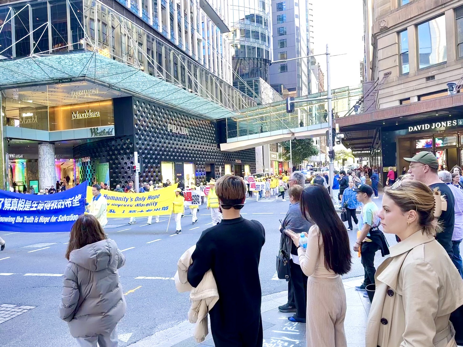 游行队伍从马丁广场出发,途径悉尼市中心主要要道,至贝尔穆尔公园(Belmore Park)结束。当天的游行队伍包含三个方阵。法轮大法好;停止迫害法轮功;声援四亿一千万勇士退出中共党、团、队(“三退”)。路途上民众被法轮大法的美好福音和正能量吸引着,纷纷赞誉世界需要真、善、忍。