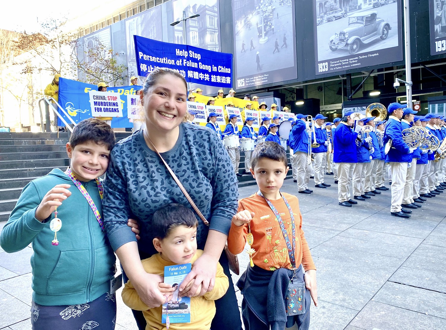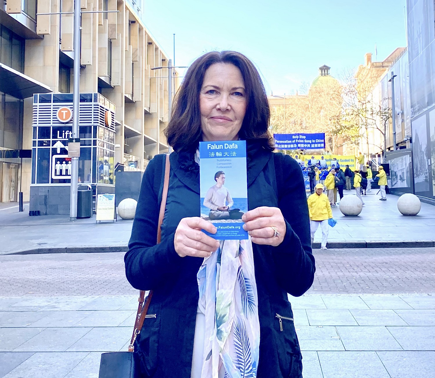 李(Lea)有三个已成年的儿子,她曾在北悉尼的一个叫Sisters of Mercy的宗教组织工作。她表示:“之前我没有听说过法轮功,现在知道了。今天,我来到马丁广场看到,(法轮功修炼者展现的)那种平静的感觉令我惊叹。因此,我的脚步不由自主地停了下来,想了解到底发生了什么。”