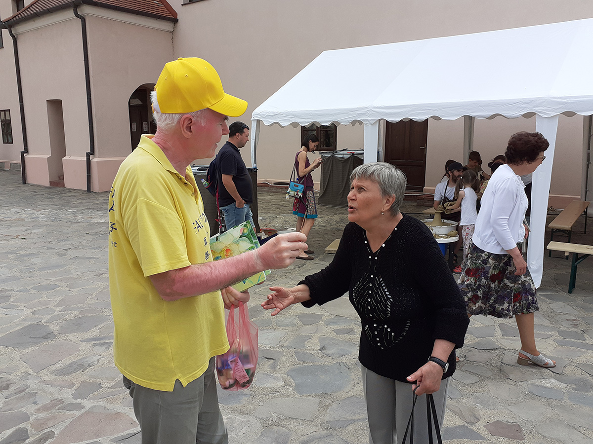 六月二十四日(星期六),马尔库夫妇来到了法轮大法学员的展台前,与学员进行了长时间的交谈,以更好地了解法轮大法。