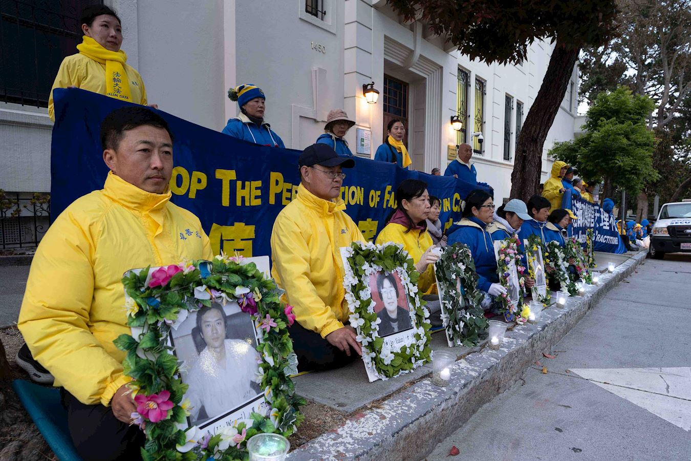 图1~9:法轮功学员在旧金山中领馆前举行烛光夜悼活动