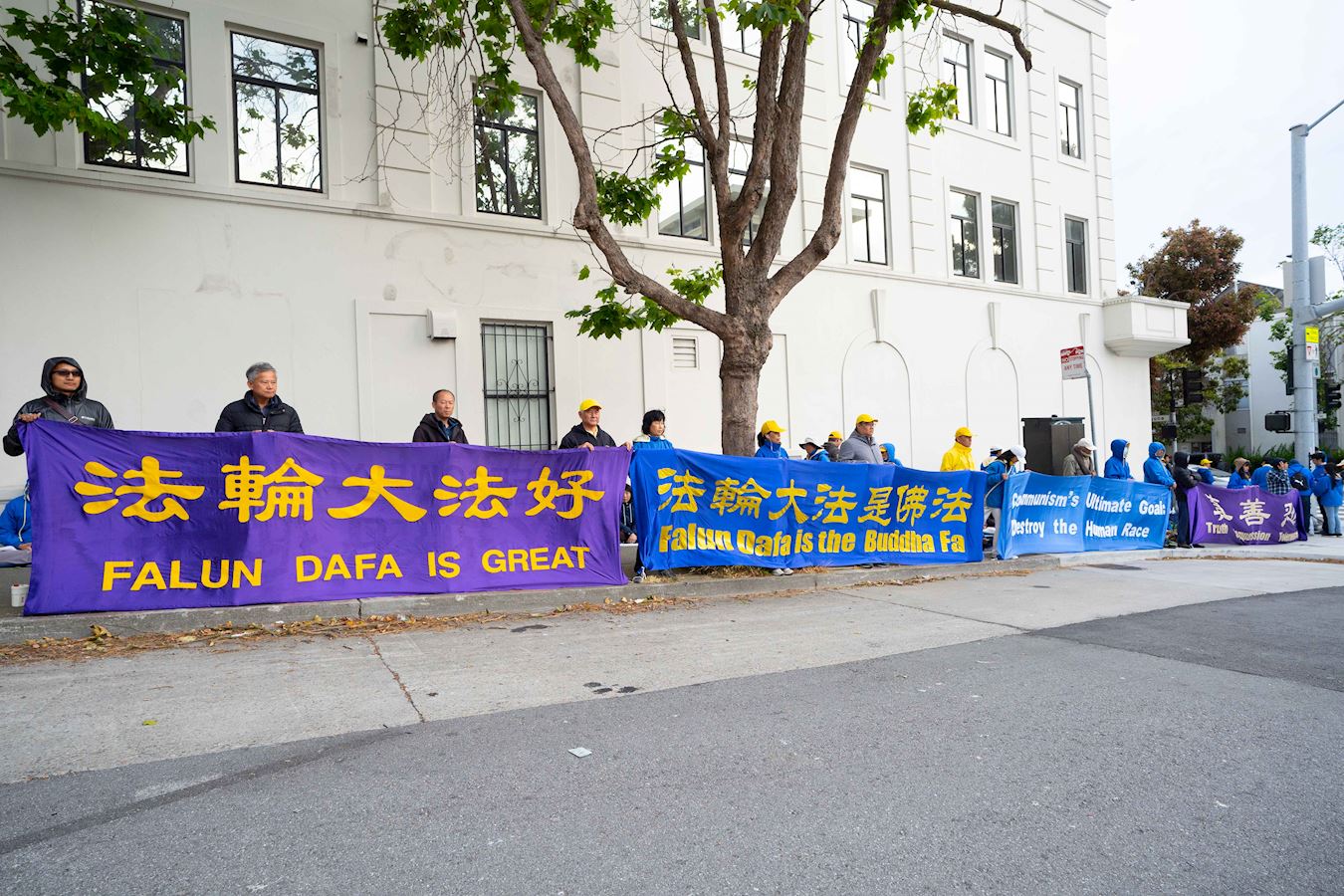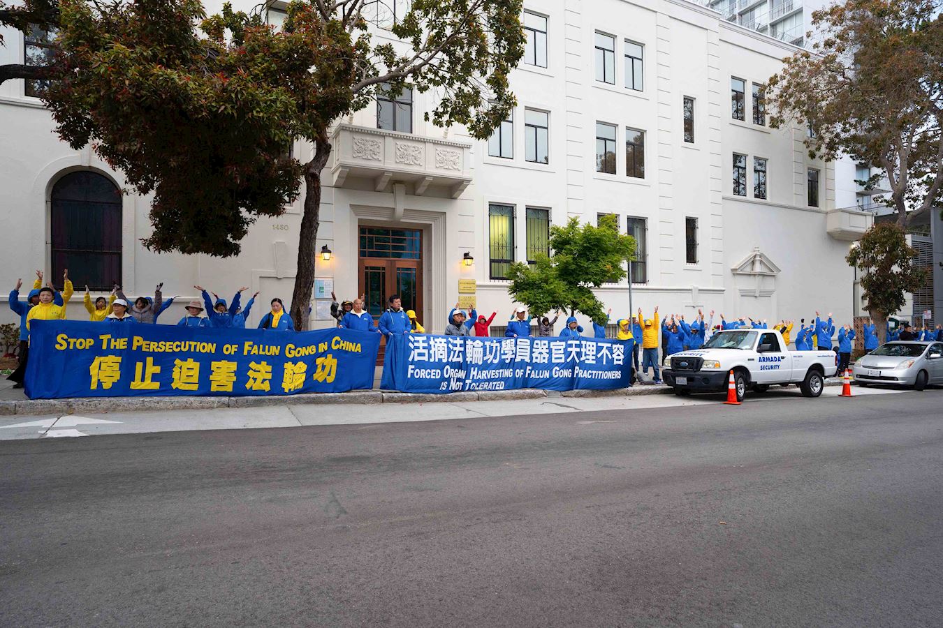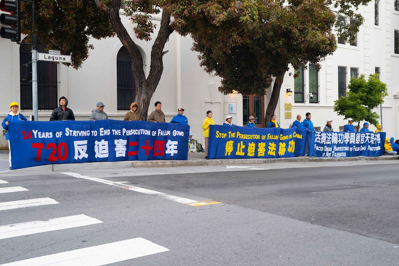 '图1~9:法轮功学员在旧金山中领馆前举行烛光夜悼活动'