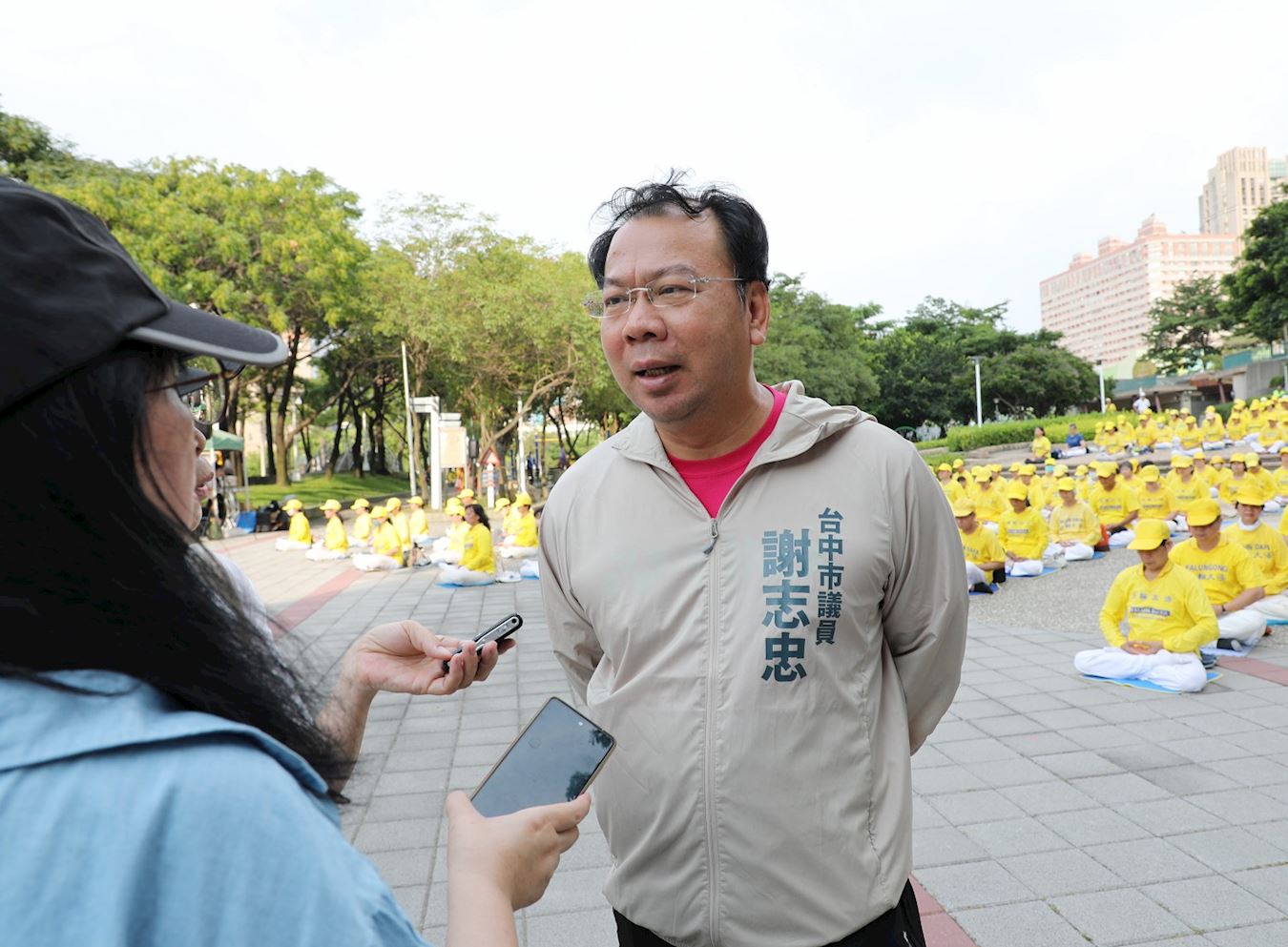 “我要向他们致上最敬礼。”台中市议员谢志忠表示,法轮功学员是一群平和、安静、健康、修行的人,“我非常支持、佩服他们”。但中共却剥夺他们的人身自由与信仰的选择。他认为,法轮功学员二十四年来的反迫害行动,如果人们还是看不清楚(中共),那到底还要多久才能看得清楚呢?他表示,已连署议会提案声援立法,并呼吁议会同仁不分党派都来支持。