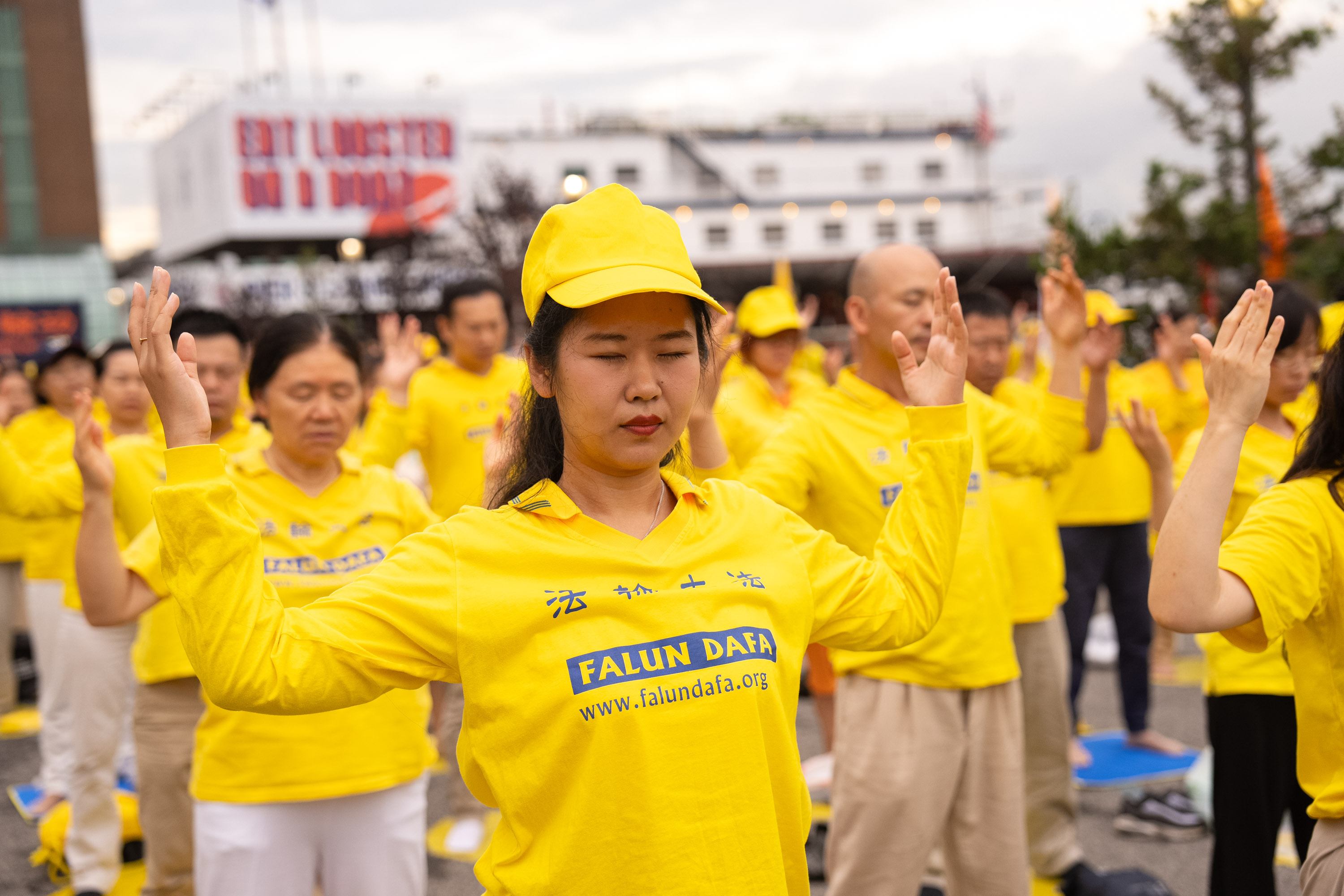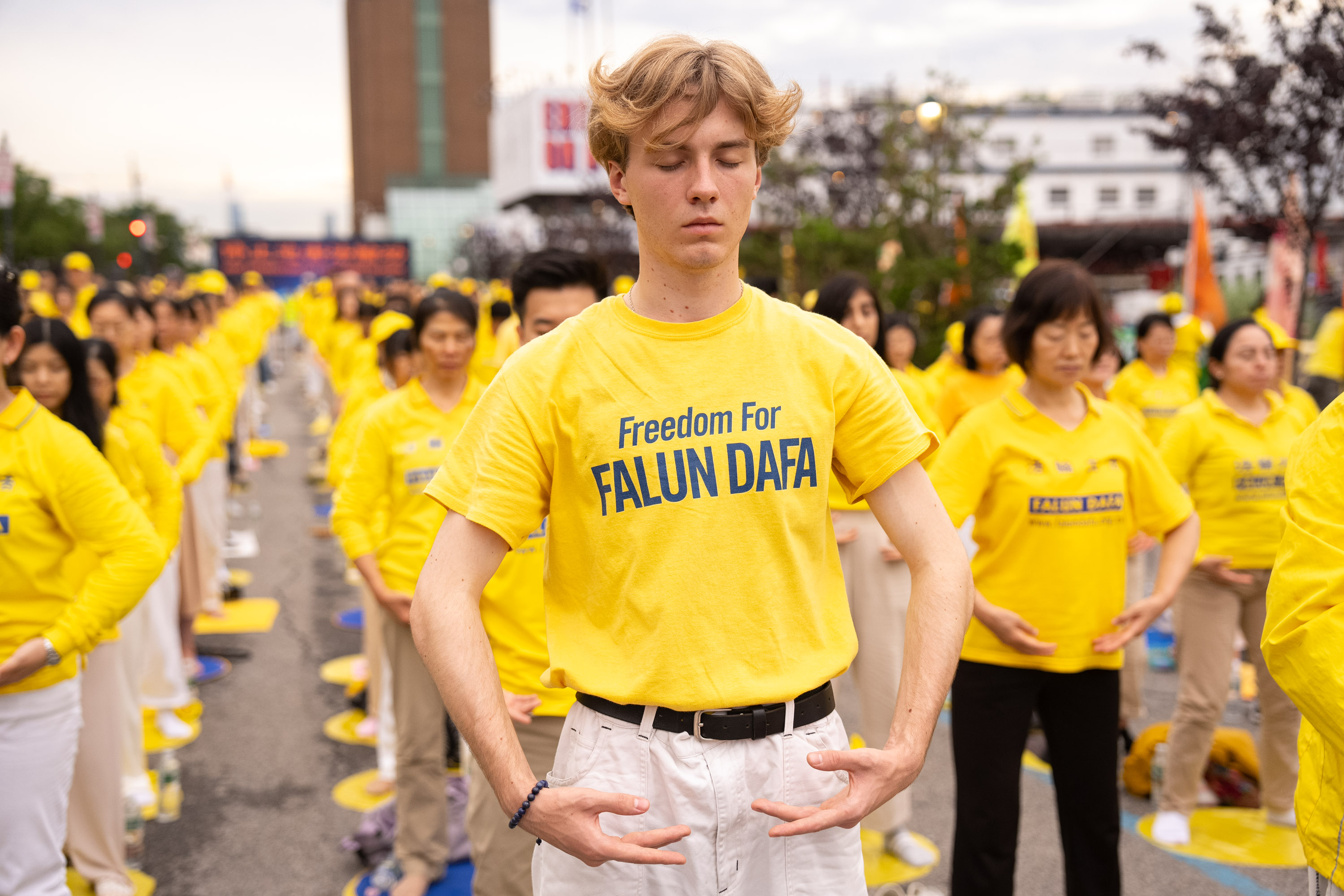 一名华人青年男子站在河边,静静地看着学员炼功。他说,自己前一天在唐人街看到了法轮功学员游行,他经常看新唐人电视台的节目,并说:“我也很想学习法轮功,很想为法轮功学员做些什么。”一位法轮功学员建议他,可以帮助传播真相,也可以上法轮大法网站(falundafa.org)学习法轮功。他诚恳地表示:“我会的。”