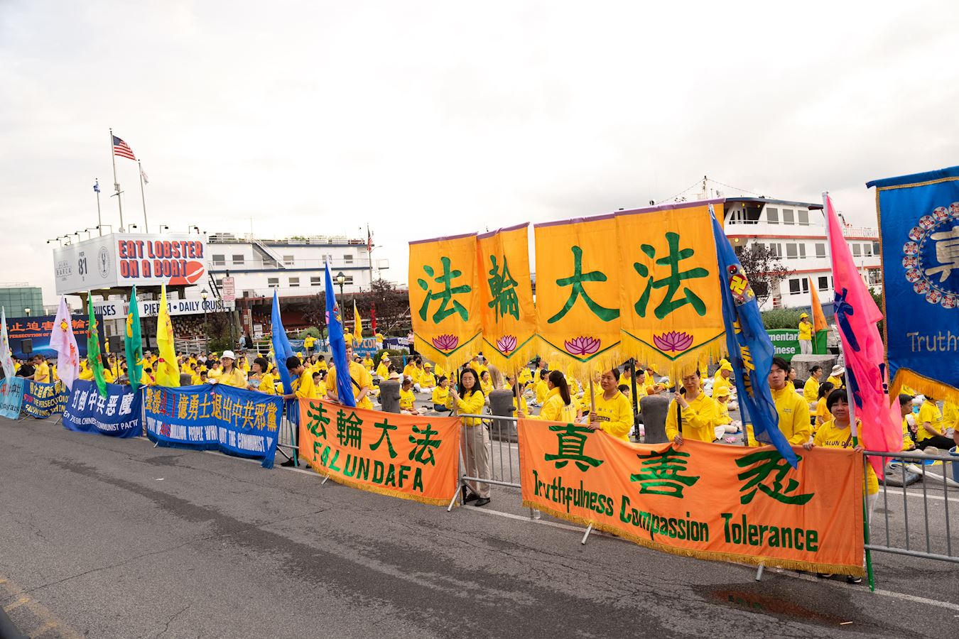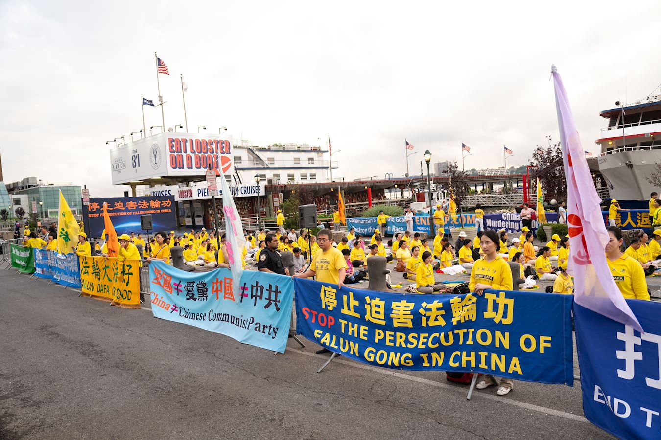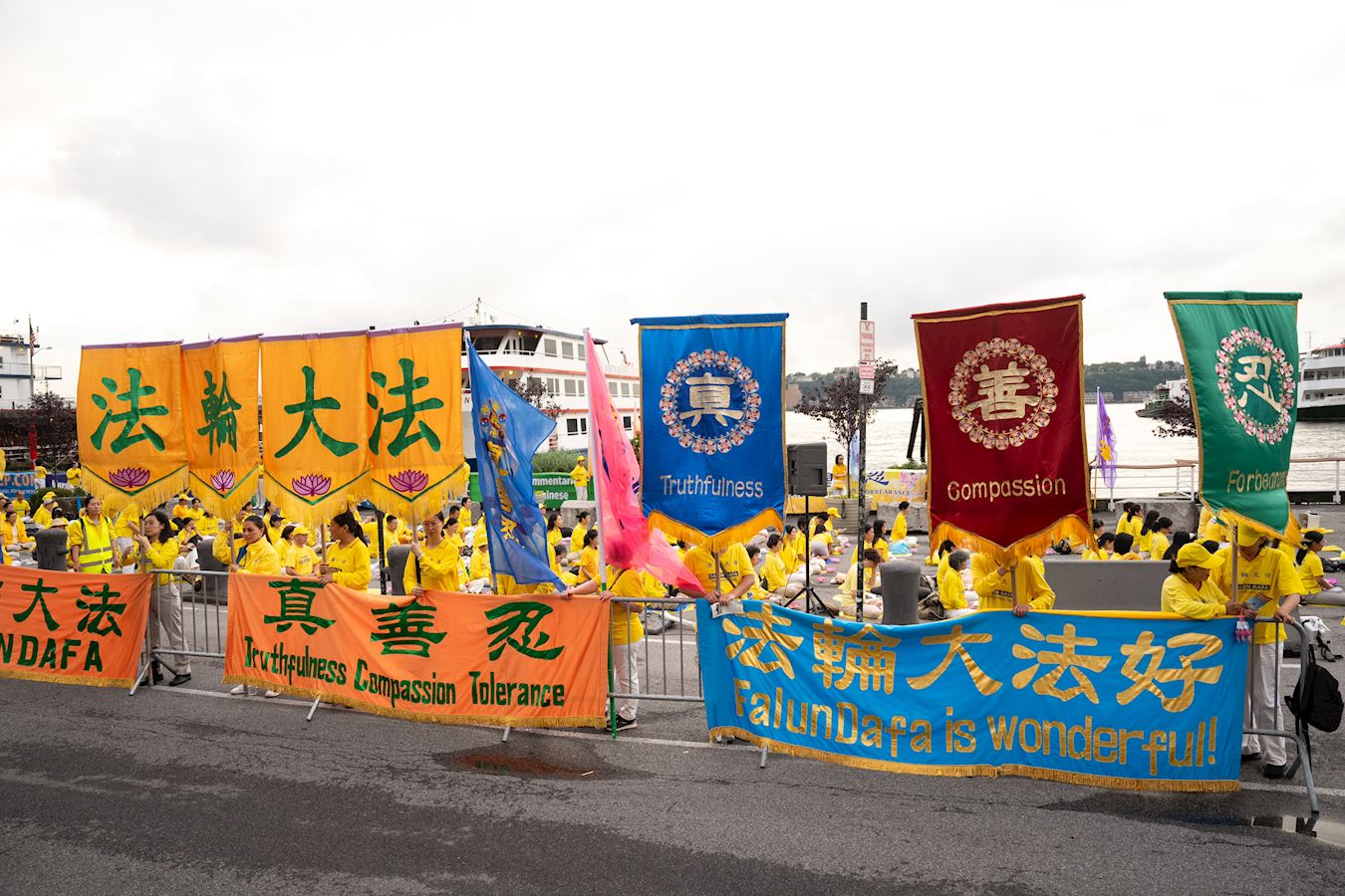 曼哈顿哈德逊河畔,法轮功学员面向中领馆打出“法轮大法”、“真善忍”、“停止迫害法轮功”、“声援4.1亿勇士退出中共邪党”等橫幅。播放全球退党大潮视频的LED真相车,环绕中领馆所在地的十二大道行驶。