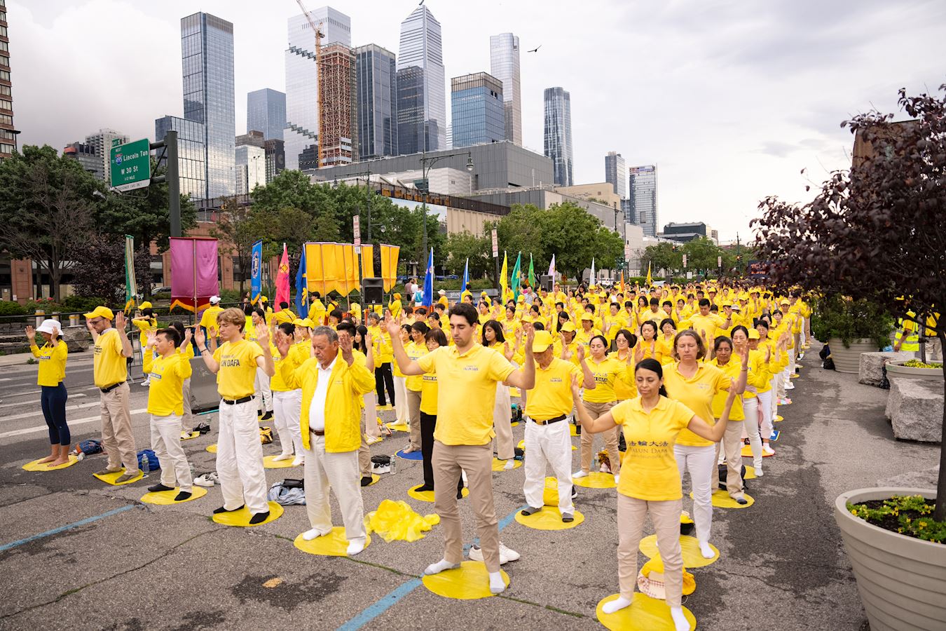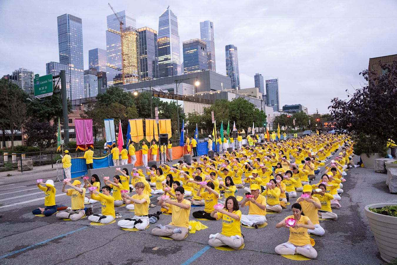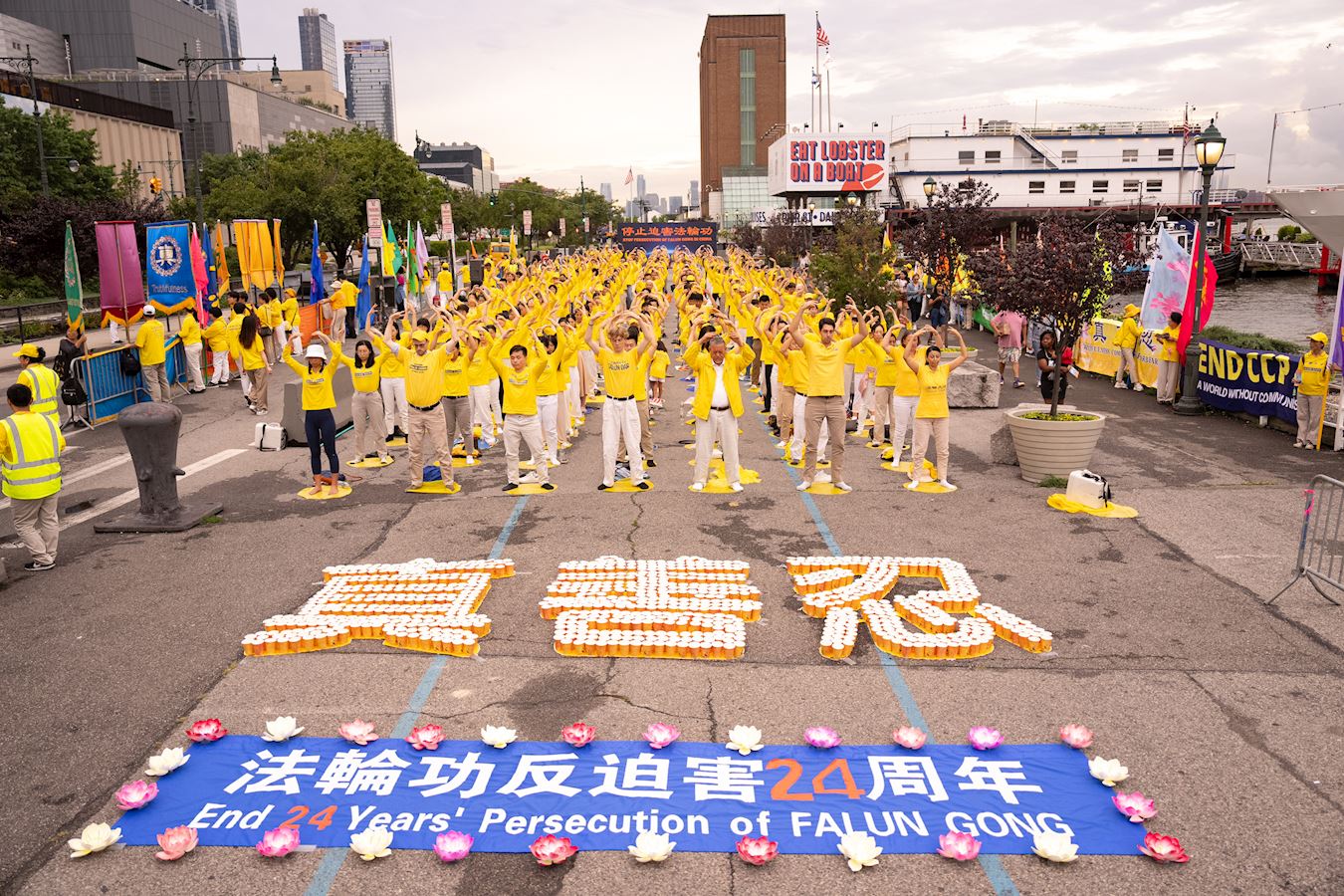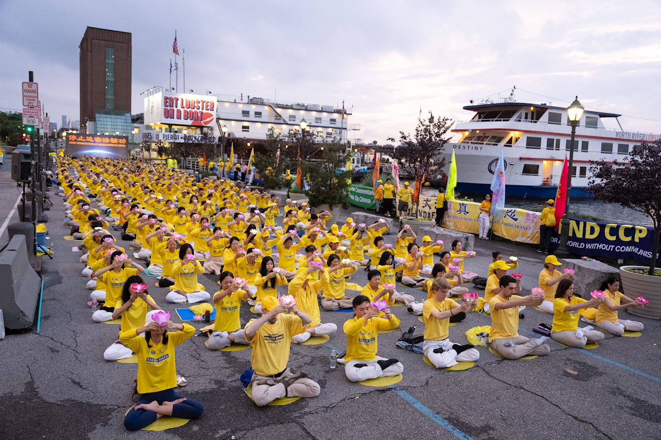 曼哈顿哈德逊河畔,法轮功学员面向中领馆打出“法轮大法”、“真善忍”、“停止迫害法轮功”、“声援4.1亿勇士退出中共邪党”等橫幅。播放全球退党大潮视频的LED真相车,环绕中领馆所在地的十二大道行驶。
