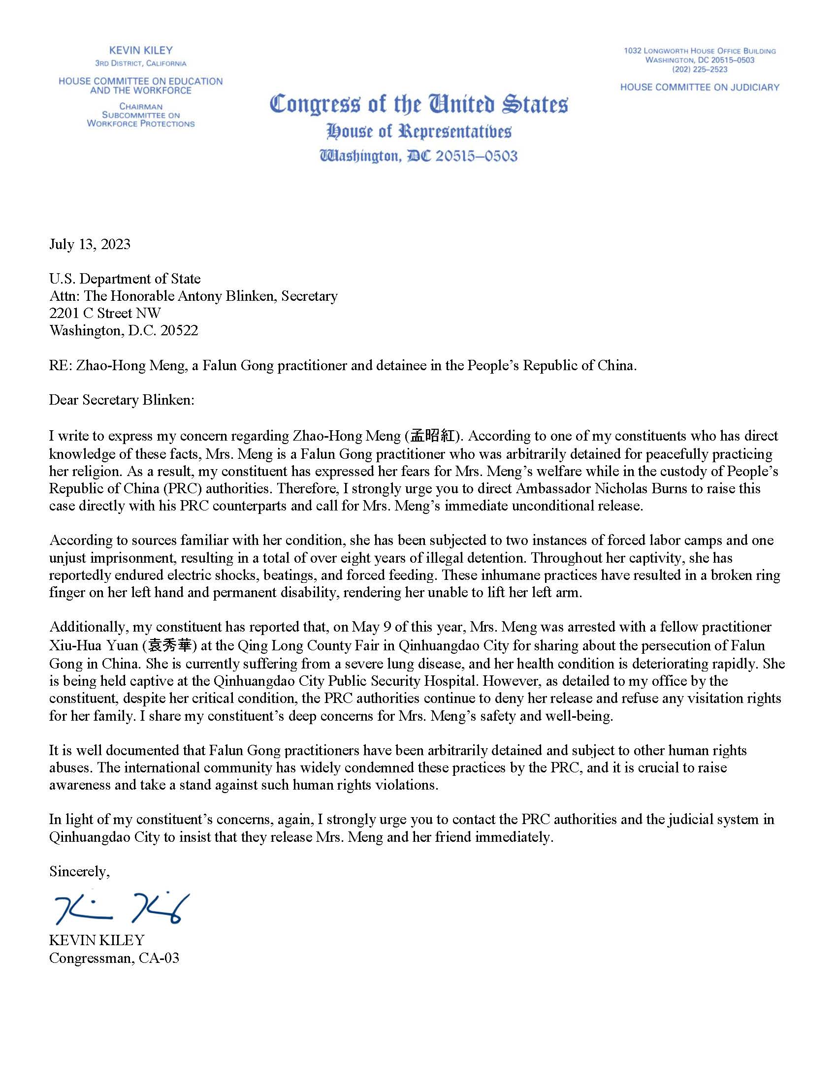 凯利议员在信中说,我写信表达我对孟昭红的担忧。据了解实情的选民说,孟昭红是一名法轮功学员,她因和平实践她的信仰而被非法关押。我的选民表达了她对孟女士在被中共当局关押期间的安危担忧。因此,我强烈敦促您指示尼古拉斯·伯恩斯(Nicholas Burns)大使向中国同行提出此案,并呼吁立即无条件释放孟昭红。