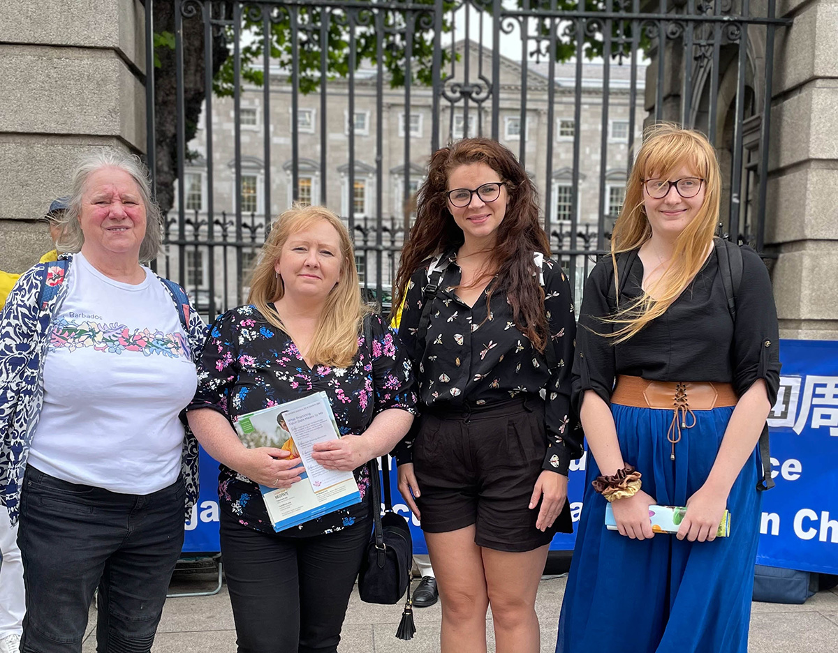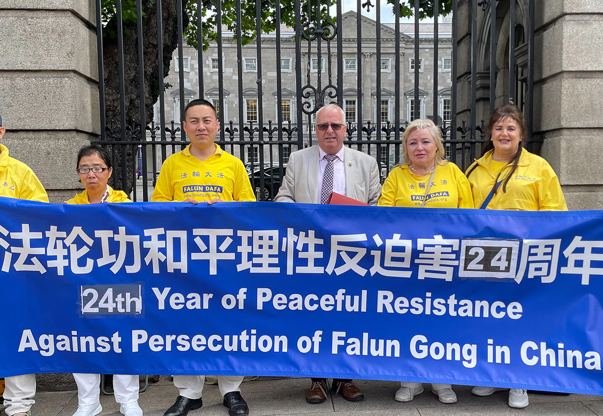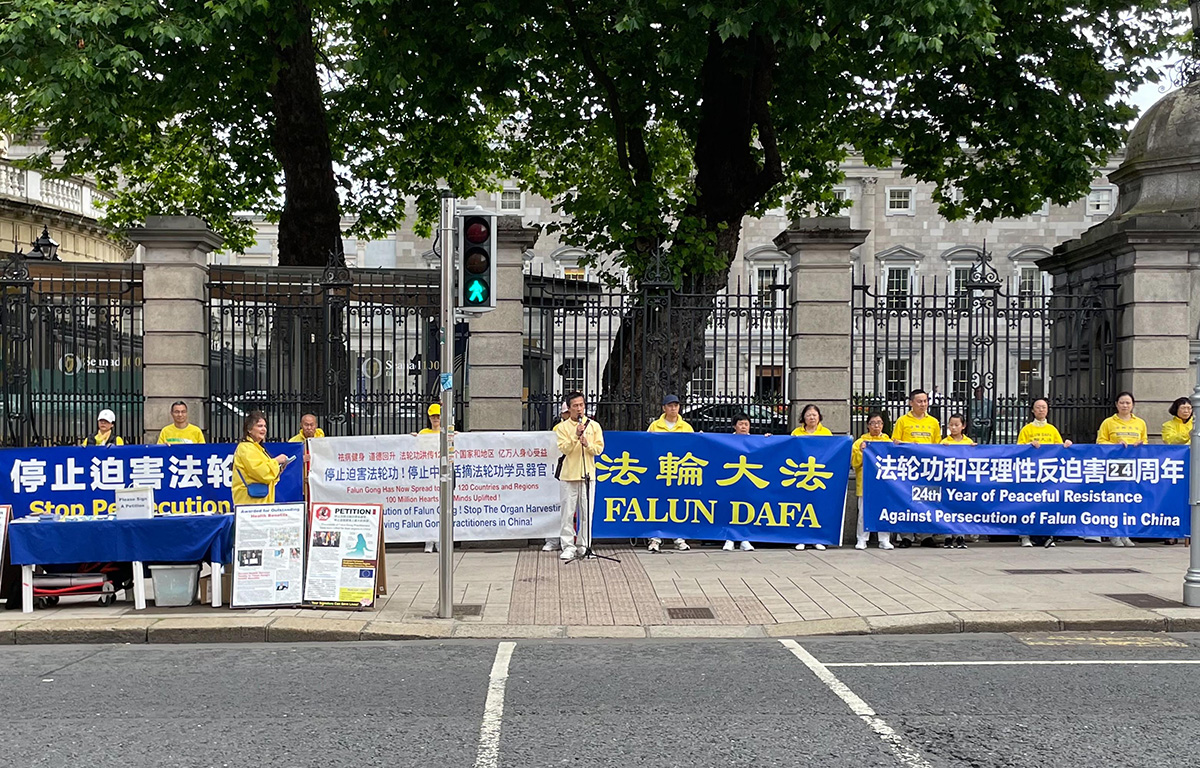 图1:二零二三年七月十二日,爱尔兰法轮功学员在国会伦斯特府(Leinster House)前集会纪念反迫害二十四周年。
