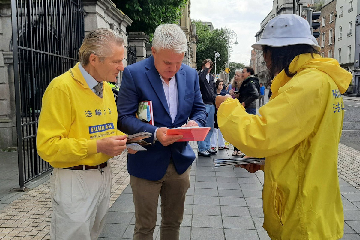 在现场签名要求制止中共对法轮功学员迫害的还有众议员约翰尼·吉尔克(Johnny Guirke)。众议员马帝·麦格拉思(Mattie McGrath)也表示声援,并与学员合影以示支持。