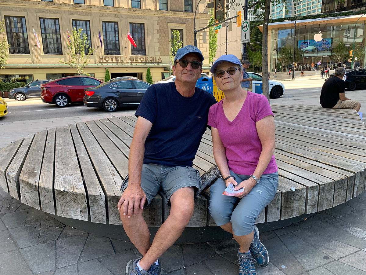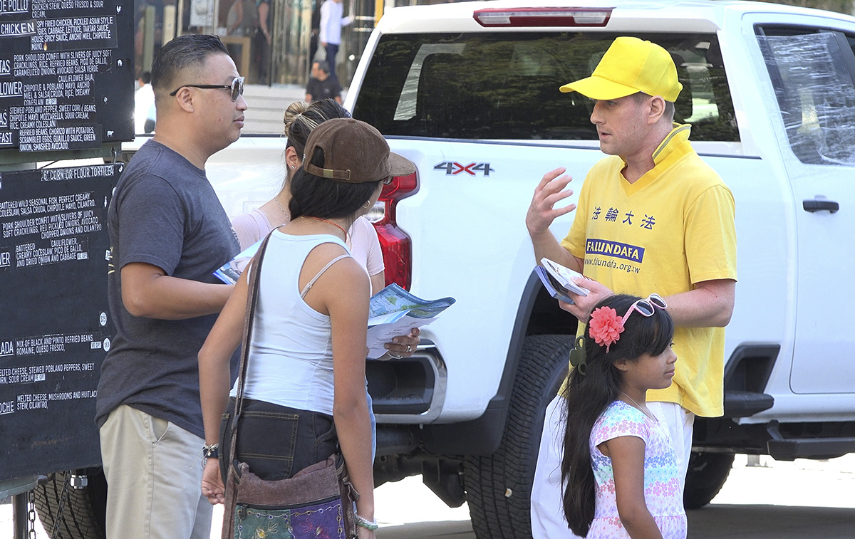法轮功学员祥和的炼功场面吸引了斯科特·菲利普(Scott Phillips)和妻子凯西(Kathy)的目光,他们从卡尔加里来旅游,凯西表示:“我们以前见过法轮功的炼功活动,也知道他们在中国和其他宗教一样受到迫害,关于(中共)活摘器官的信息也知道,就像维吾尔人也被活摘器官。这太糟糕了!”