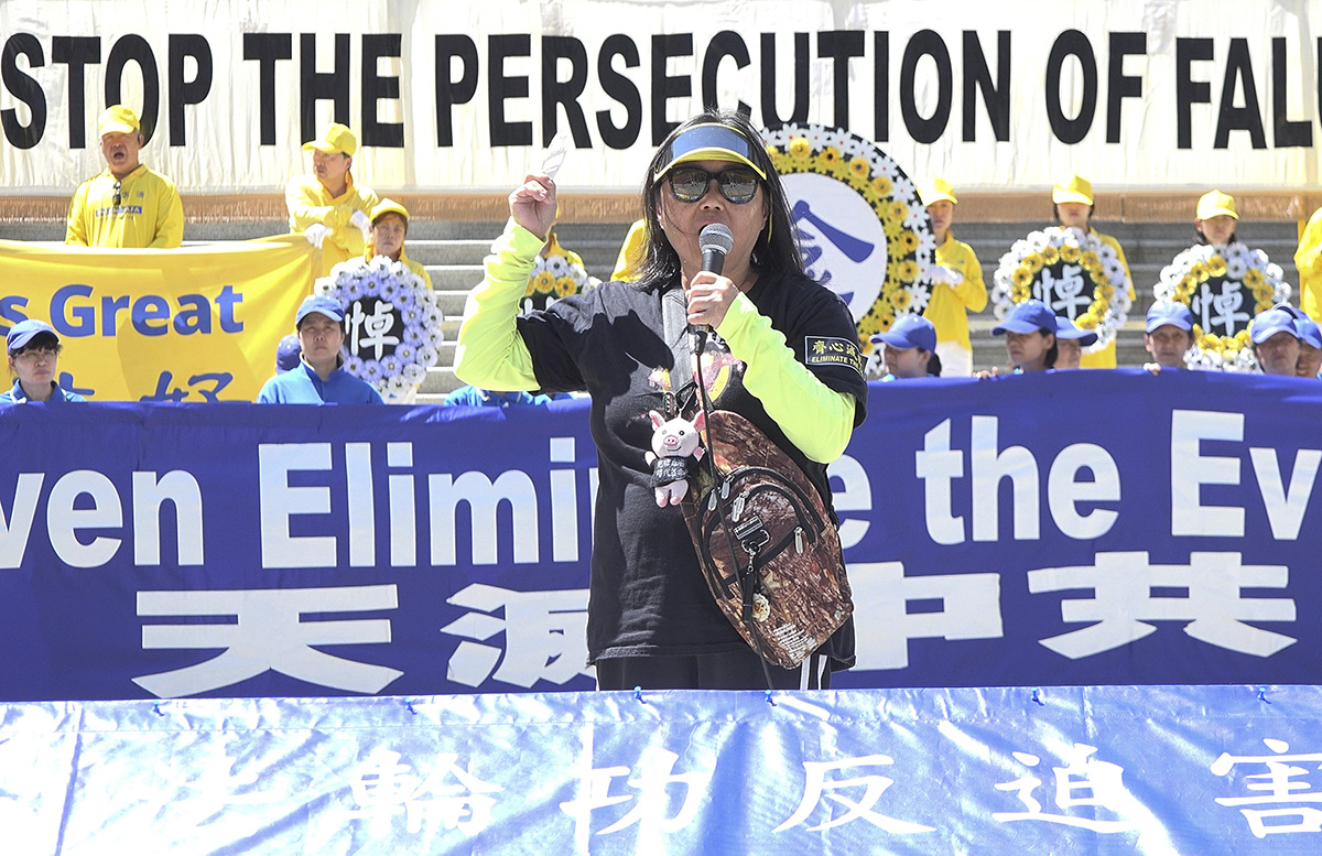退党服务中心代表方女士在集会上呼吁:“体制内外的所有人士认清中共的邪恶,声明退出邪党及其附属组织,在良知的拷问面前、在即将到来的历史对中共的审判面前,选择正义。”