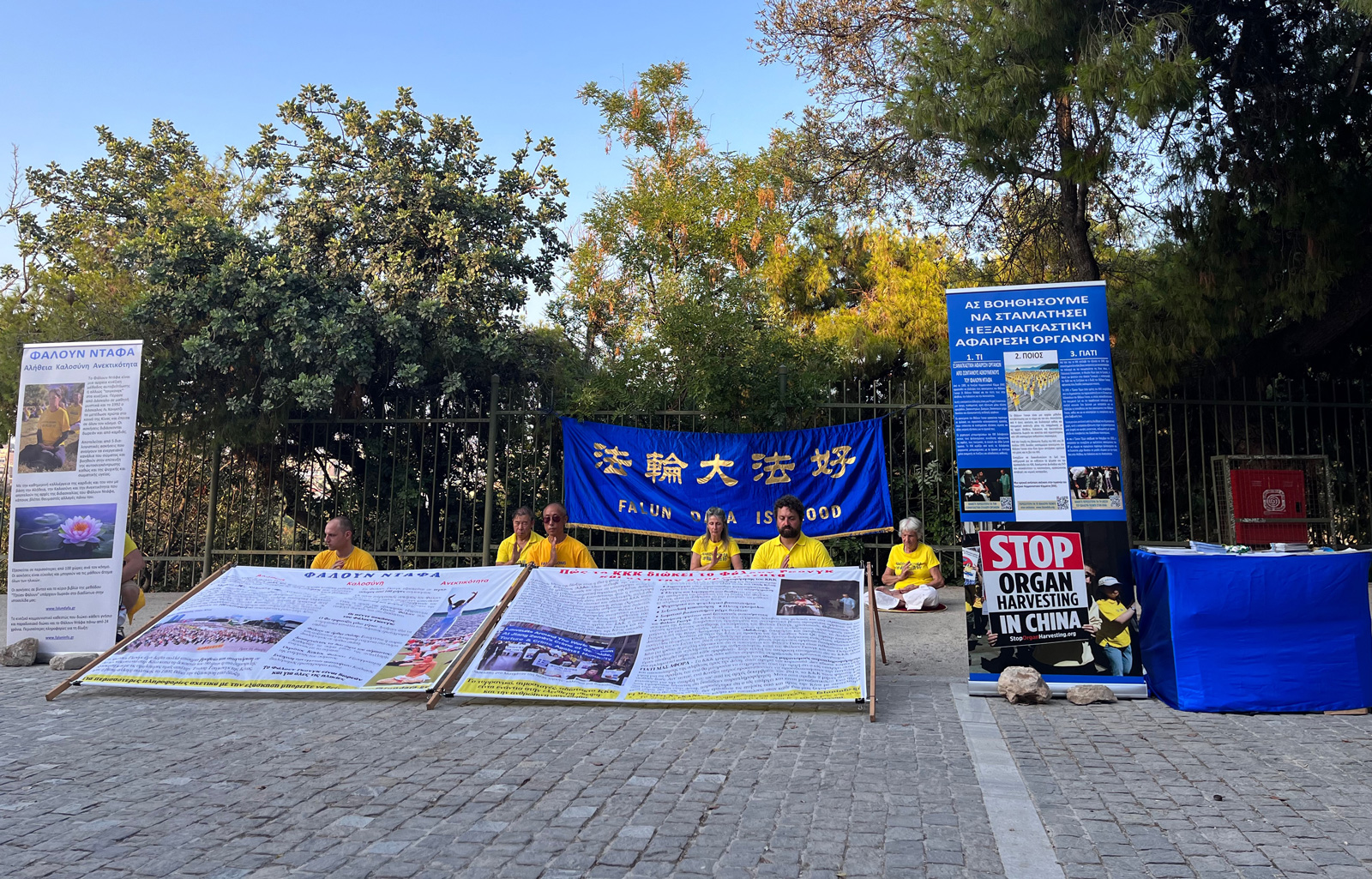 当天正值热浪“克里昂”(Cleon)肆虐的高峰,雅典卫城下午时段暂时关闭,往日商业街上密集的商贩不见了踪影,行人也都步履匆匆。法轮功学员们不为高温所动,平静祥和的演示功法和发放传单。