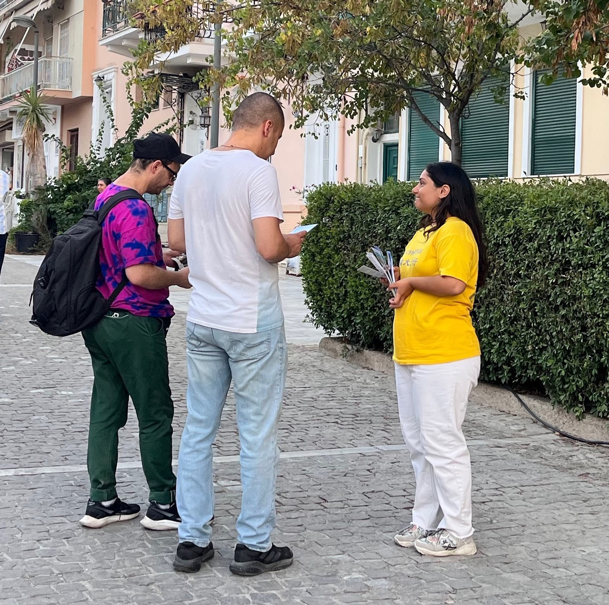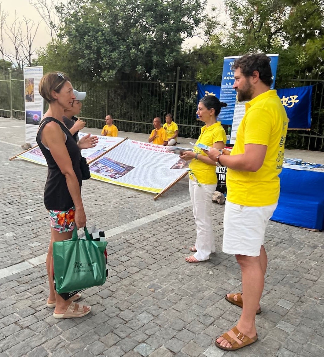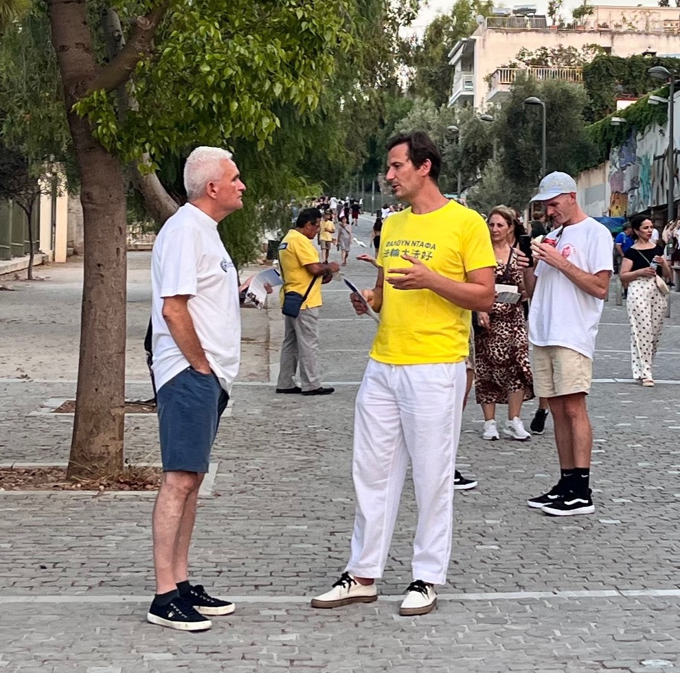 希腊人阿吉洛斯(Agelos)与太太迪米特里(Dimitri)散步经过,他接过传单后说:“我知道你们(法轮功学员)在中国受到的迫害。是江泽民发起的对吧?”学员说,是的,江泽民由于嫉妒而发动对法轮功学员的迫害。