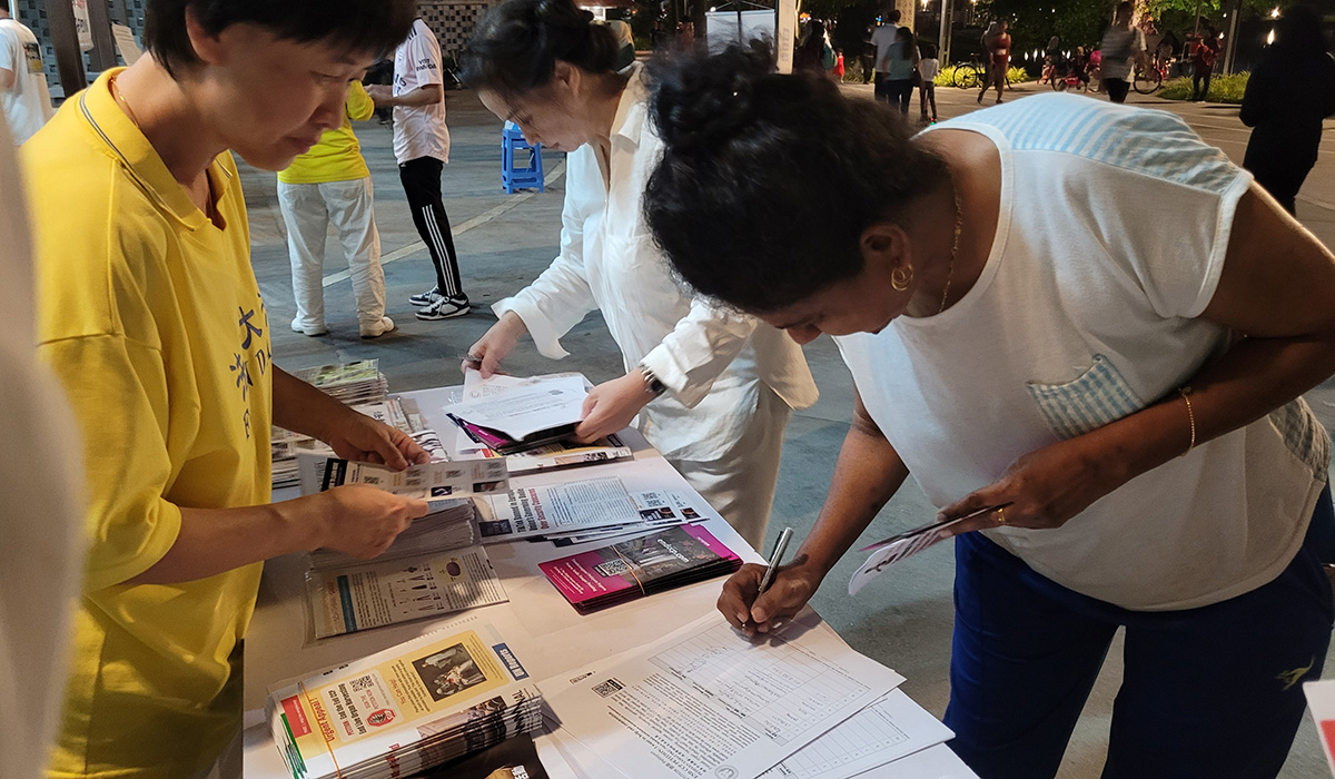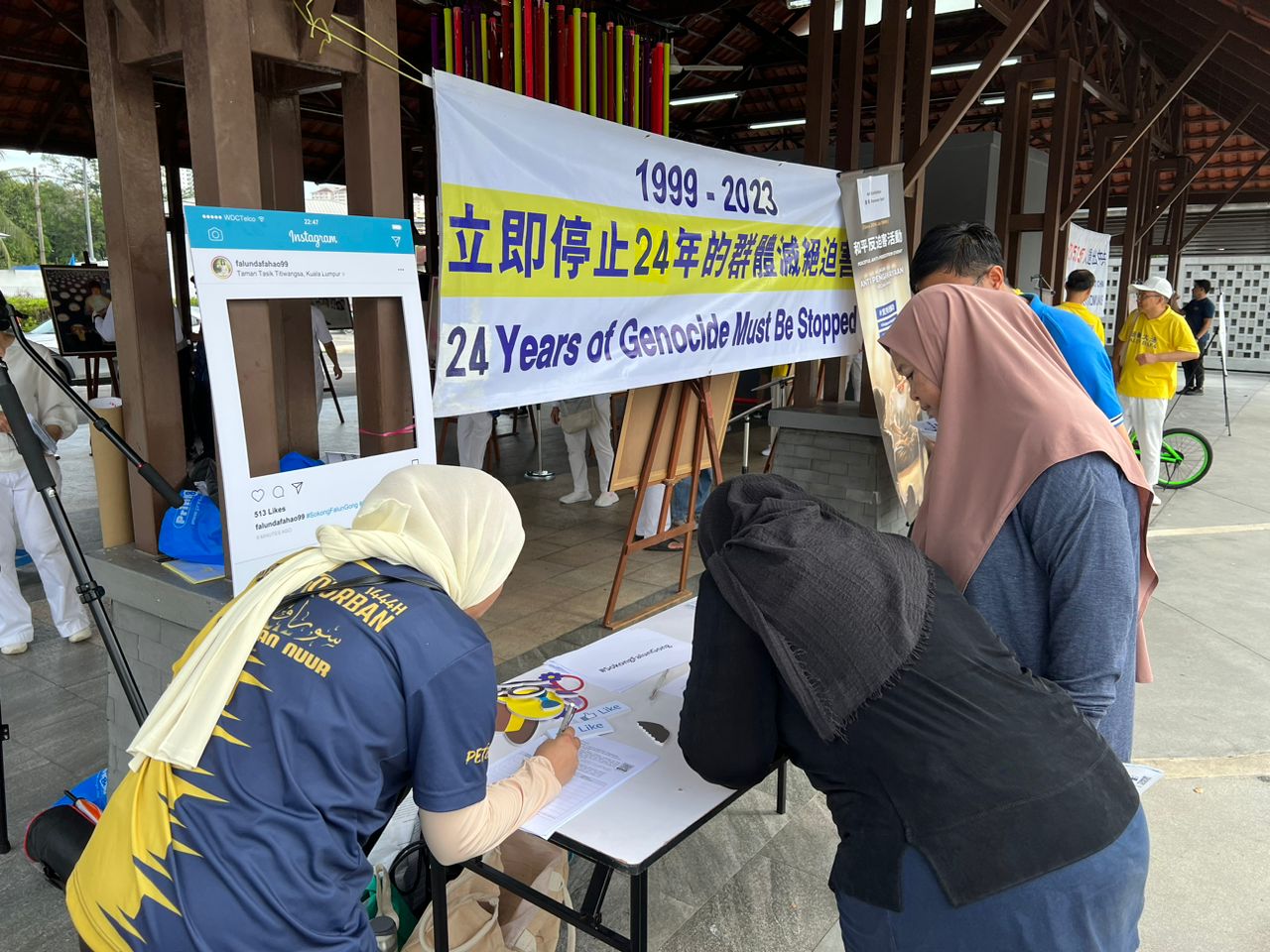 现场观看的民众纷纷表示,中共对法轮功的迫害,就是对人性的迫害,对人类的迫害,所有人都要一起制止这种罪恶。有大陆来的游客当场作了三退,也有马来西亚华裔学功,还有表示支持法轮功的民众询问他们需要怎么样做。很多民众现场签名反对迫害。