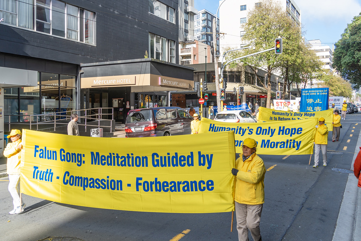 临近中午时分,由法轮功学员组成的天国乐团打头阵,从市中心古巴(Cube)街出发,在主要商业中心米德兰(Midland)公园,稍作停留演讲后,抵达新西兰国会大厦。在国会大厦门前,三位法轮功学员讲述了他们在中国遭受迫害的亲身经历,希望民众认清中共的邪恶本质,共同反对迫害,解体中共。