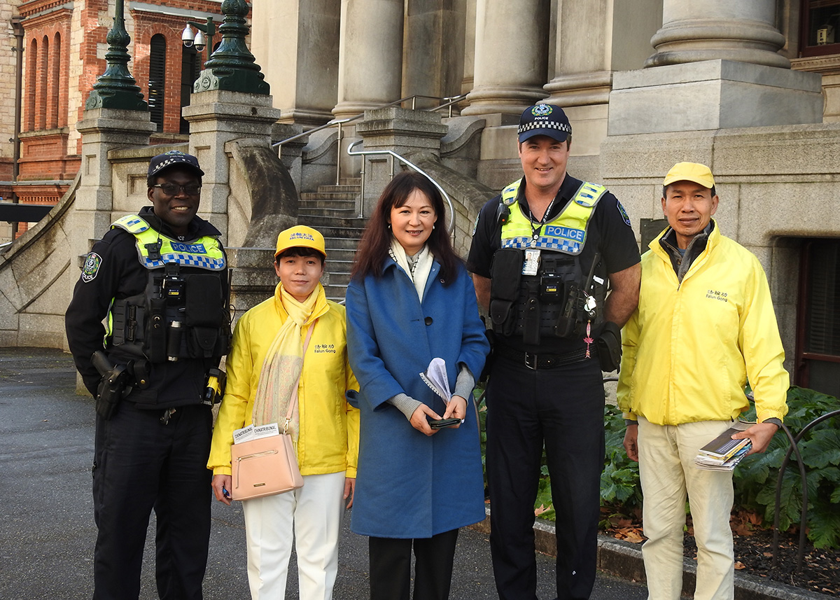 ![]() 图10:负责执勤的警察肖恩和他的伙伴与法轮功学员合影 |