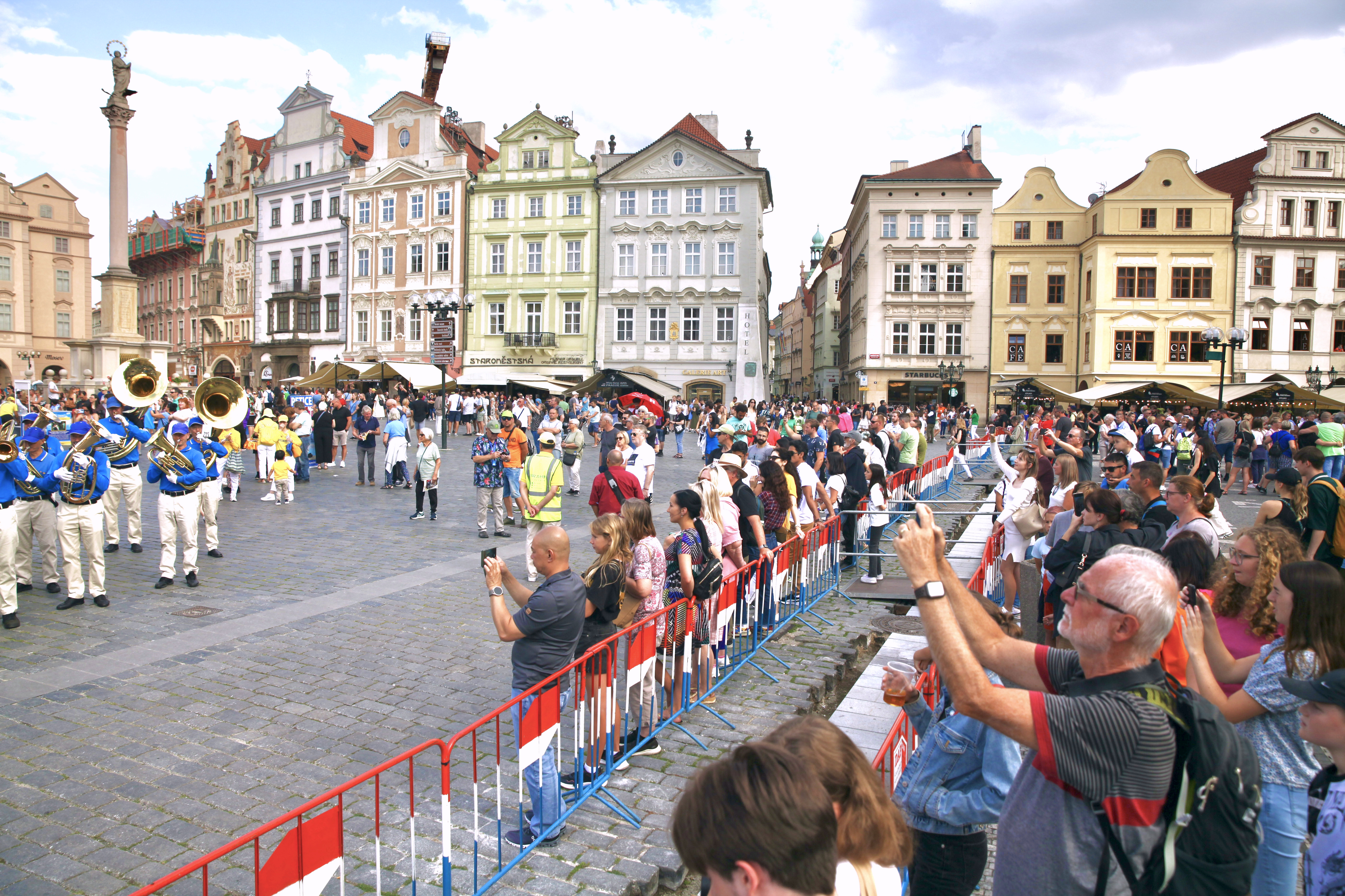 ![]() 图1~2:二零二三年七月二十二日,欧洲多国法轮功学员云集捷克首都布拉格,举办集会游行。图为在布拉格老城广场(Staroměstské náměstí)的集会现场。 |