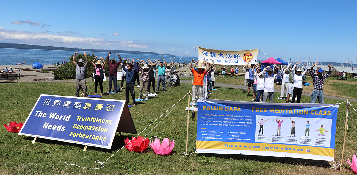 ![]() 图1~2:西雅图法轮功学员在滨海海滩公园集体炼功。 |