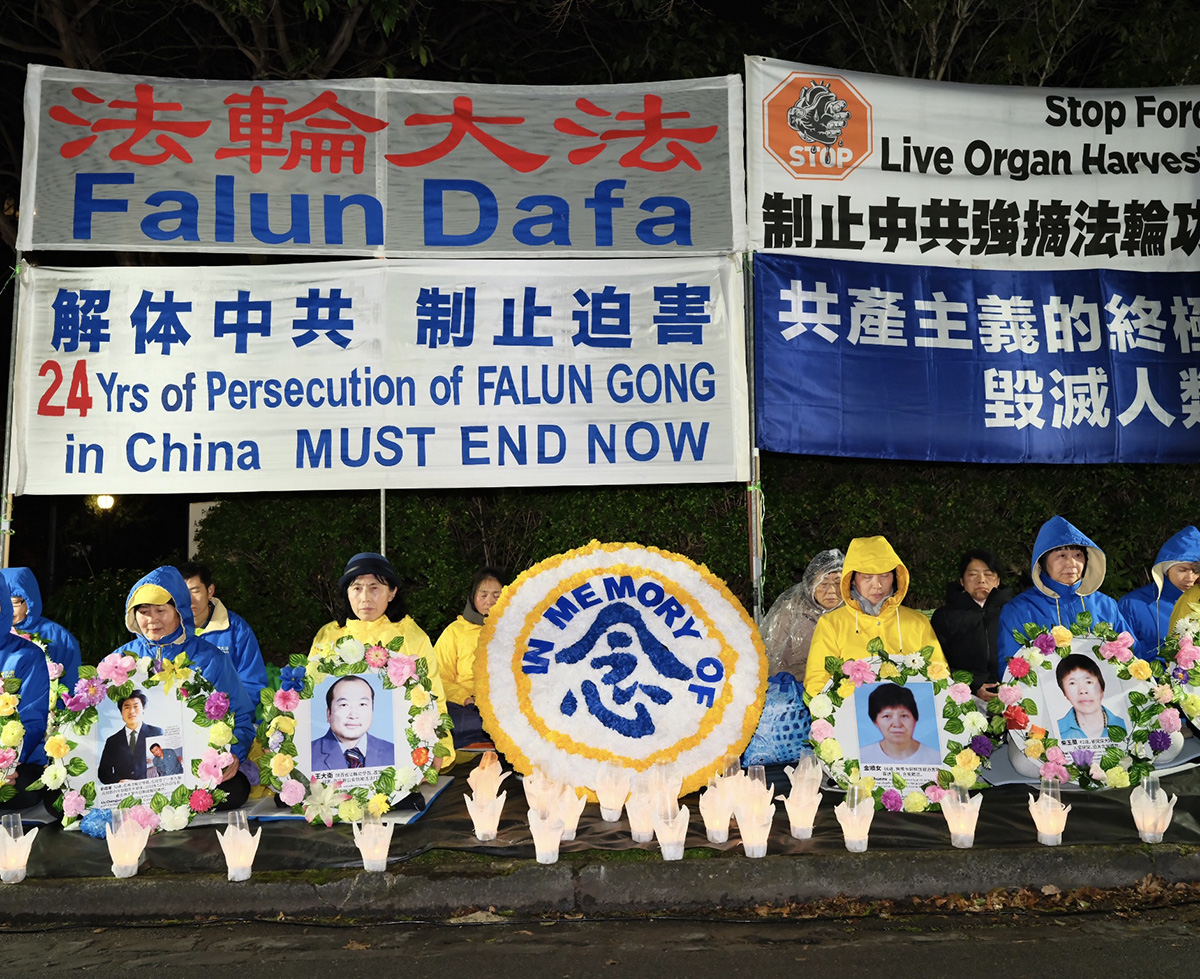 ![]() 图9~10:2023年7月20日晚,南半球冬日寒冷的雨夜中,墨尔本学员们在中领馆对面举行了烛光悼念活动。 |