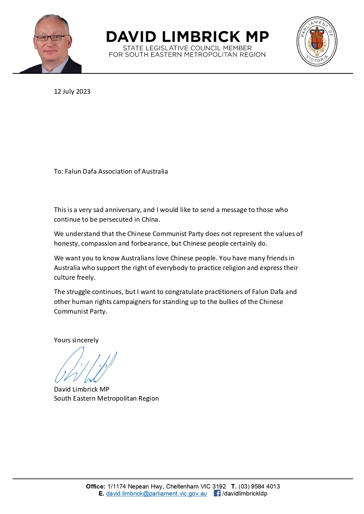 维州立法会议员、维州自由民主党东南区议员林布里克(David Limbrick)给澳洲法轮大法学会发来信件声援。