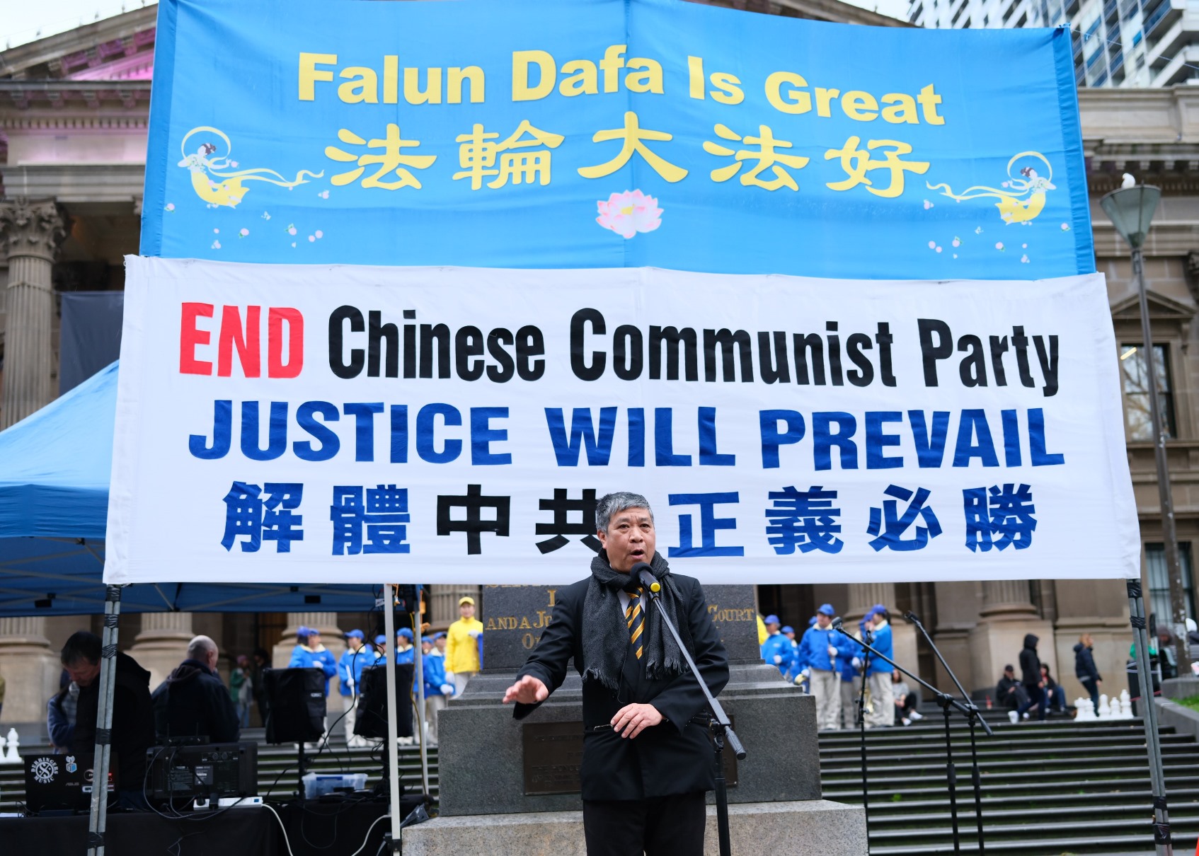 维州法轮大法学会负责人樊惠强说:“二十四年来,中国千百万法轮功修炼者遭受警方的拘留、监禁、酷刑、折磨致死;还有很多人被活体摘取器官。”
