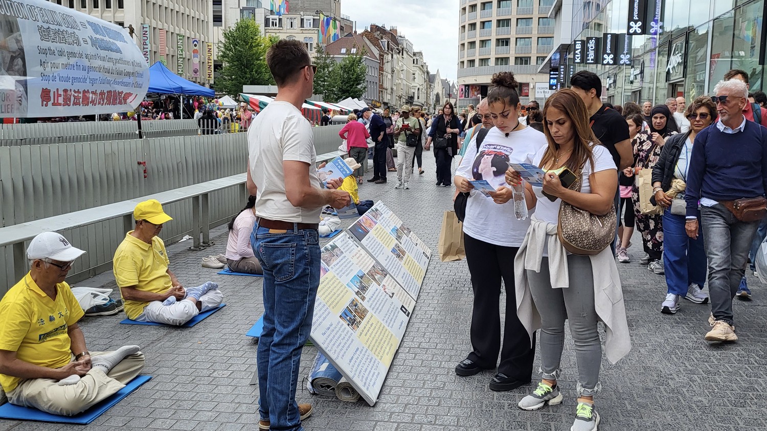 商业街上人流如织,学员们展示法轮功的五套功法,许多市民及游客被悠扬的炼功音乐和学员们舒缓的动作吸引来到活动场地,询问学员想了解更多关于法轮功的信息,以及中共为什么迫害法轮功。明白真相的民众纷纷签名支持学员反迫害;许多人询问在哪里可以学炼法轮功。