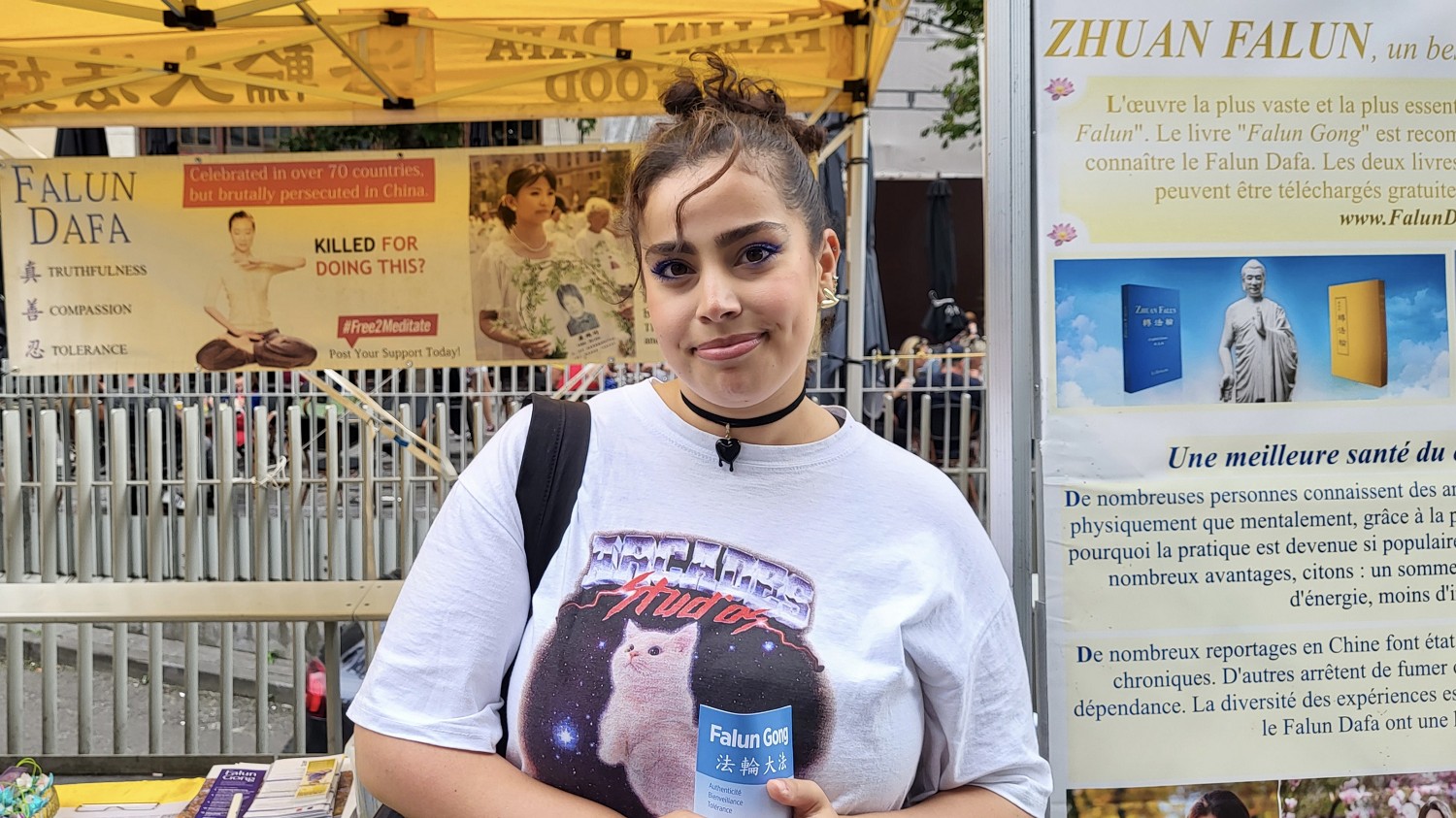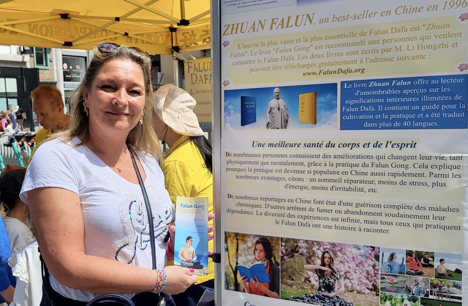 面带微笑的乔恩(Jone)向学员询问哪里可以学习法轮功?她问及学习费用时,学员告诉她是免费义务教功,她很惊讶。她说:“今天是美好的一天,因为我读了你们的真相资料,看到他们在炼功,我很感兴趣,下周我会很高兴在炼功点上学炼法轮功。”