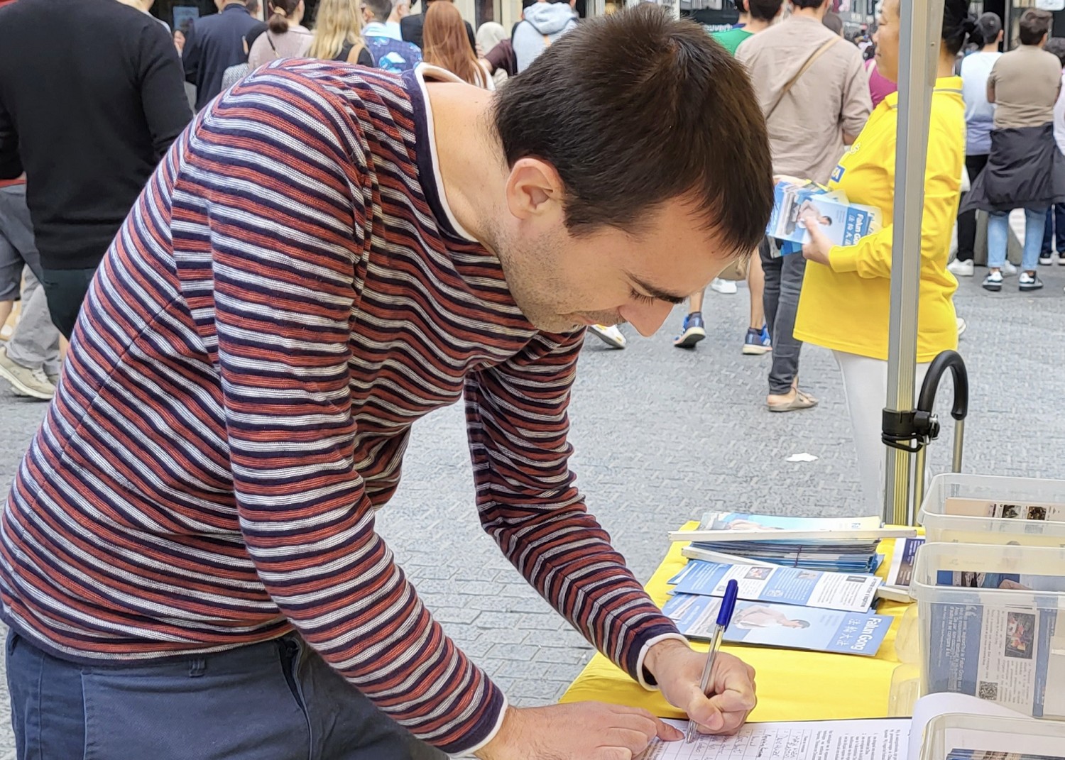 在布鲁塞尔就读商学的印度尼西亚籍留学生达萨(Dassa)流连在数据桌前查看信息并签名反迫害。他说他刚刚才知道这个情况,他从没想到当今还会有活摘器官的事情,他问:“为什么他们(法轮功修炼人)只是因为炼功和信仰就被迫害?” 达萨并说:“人类不应该有这种迫害,我们以后也不应该有这种迫害。”