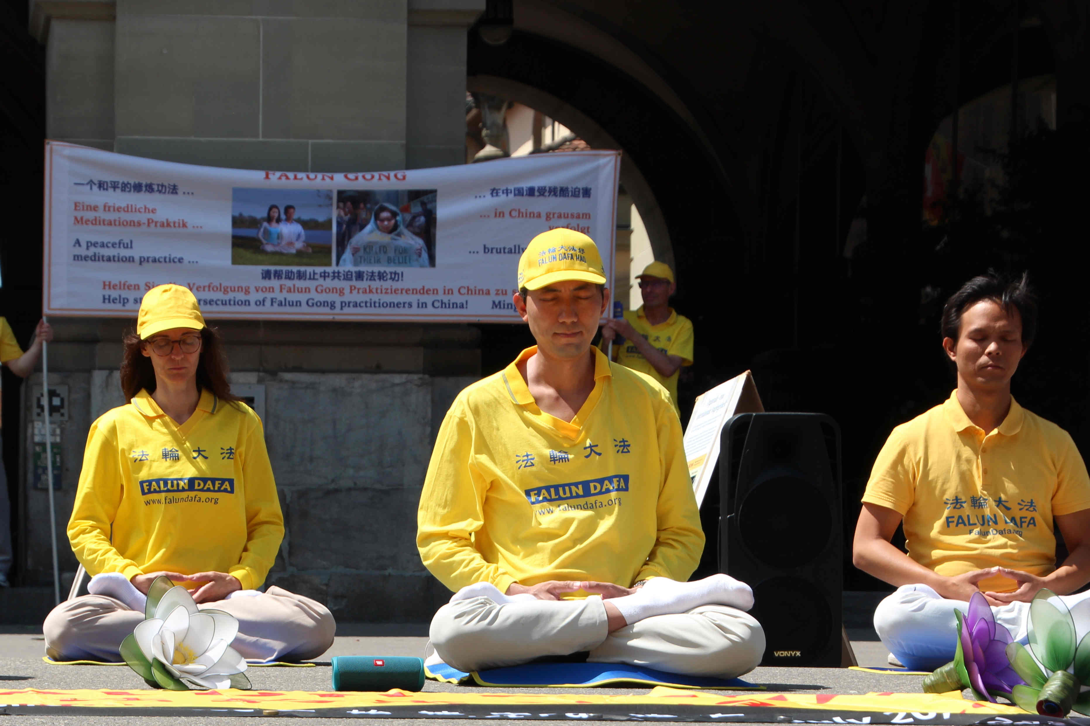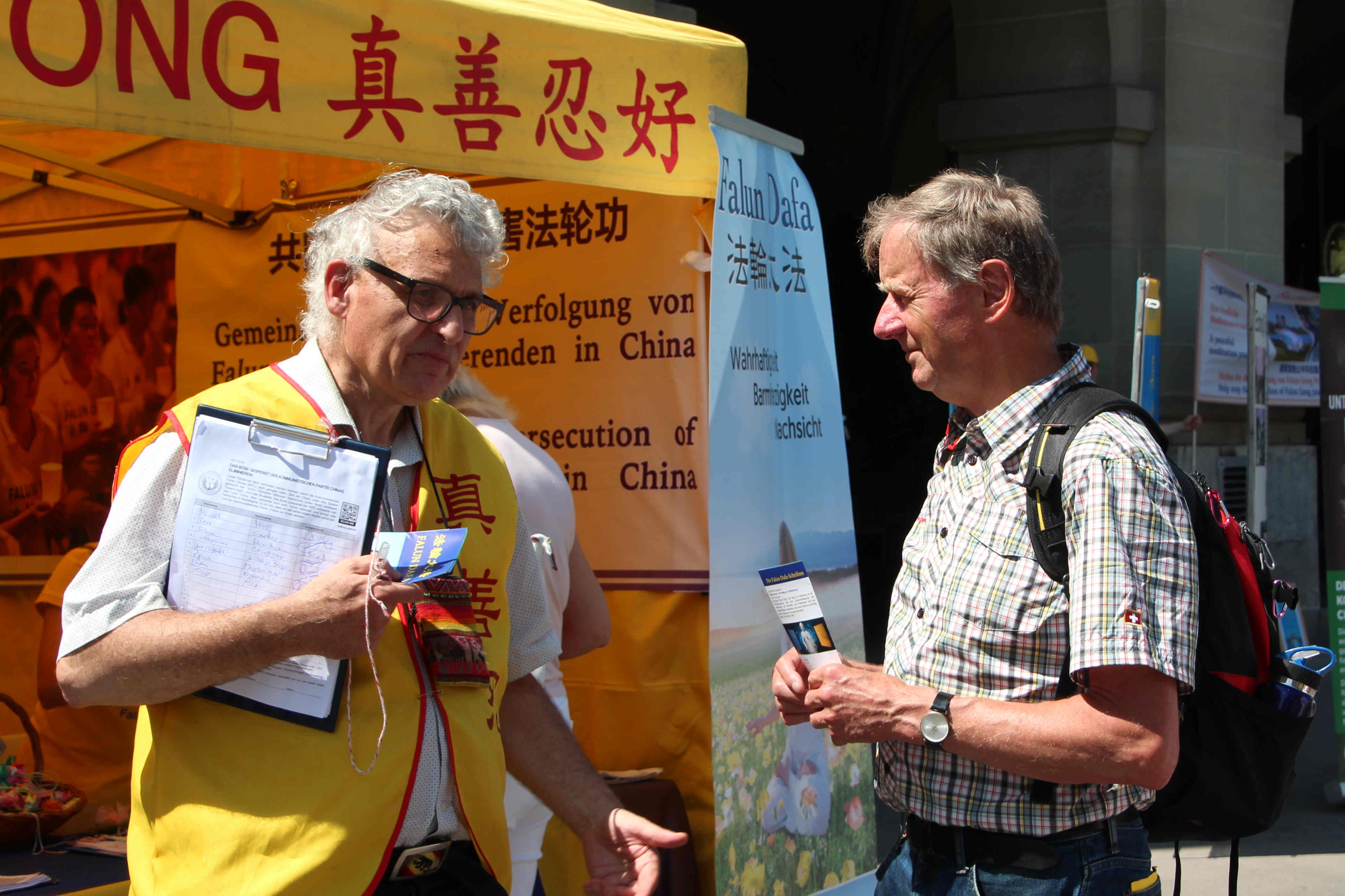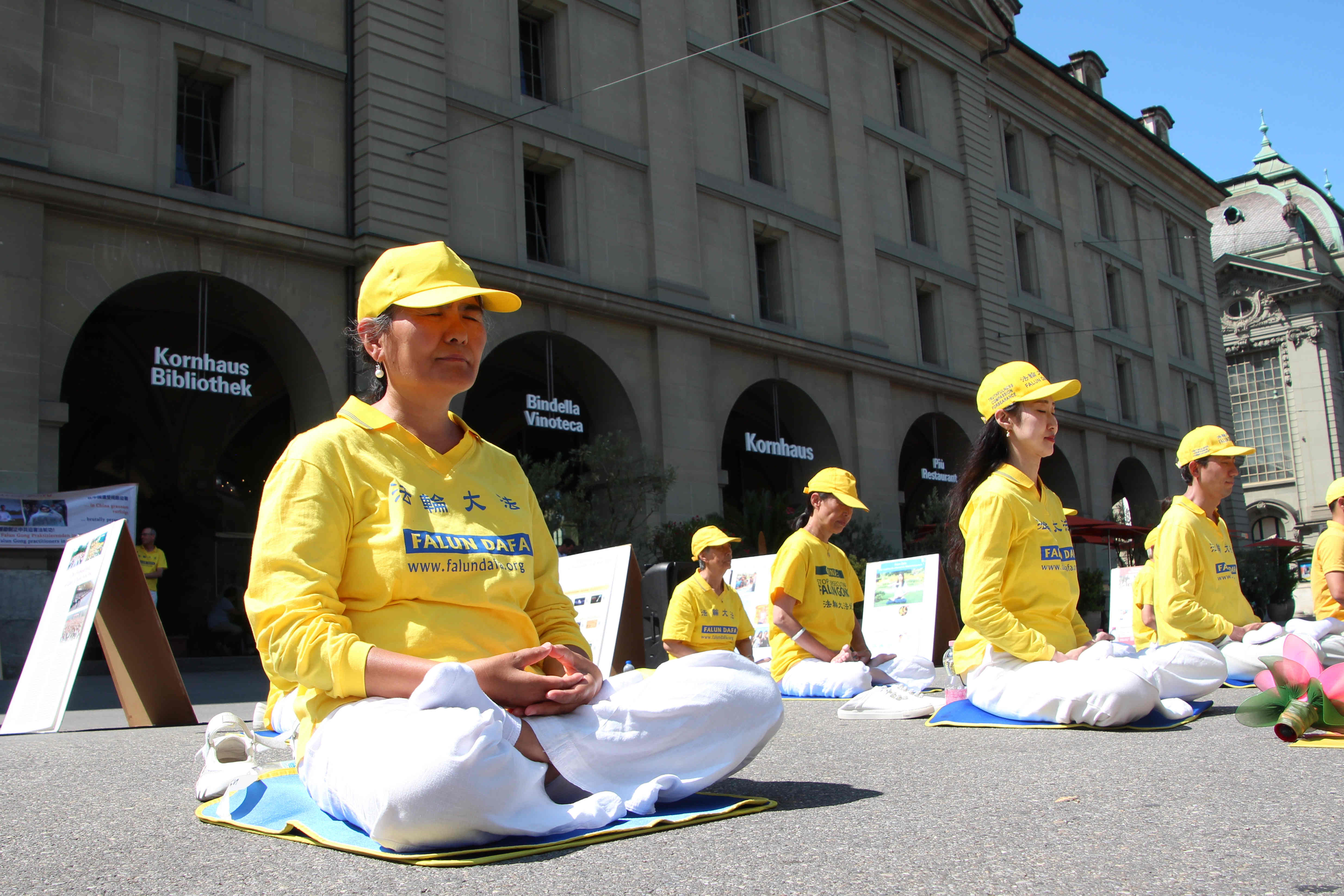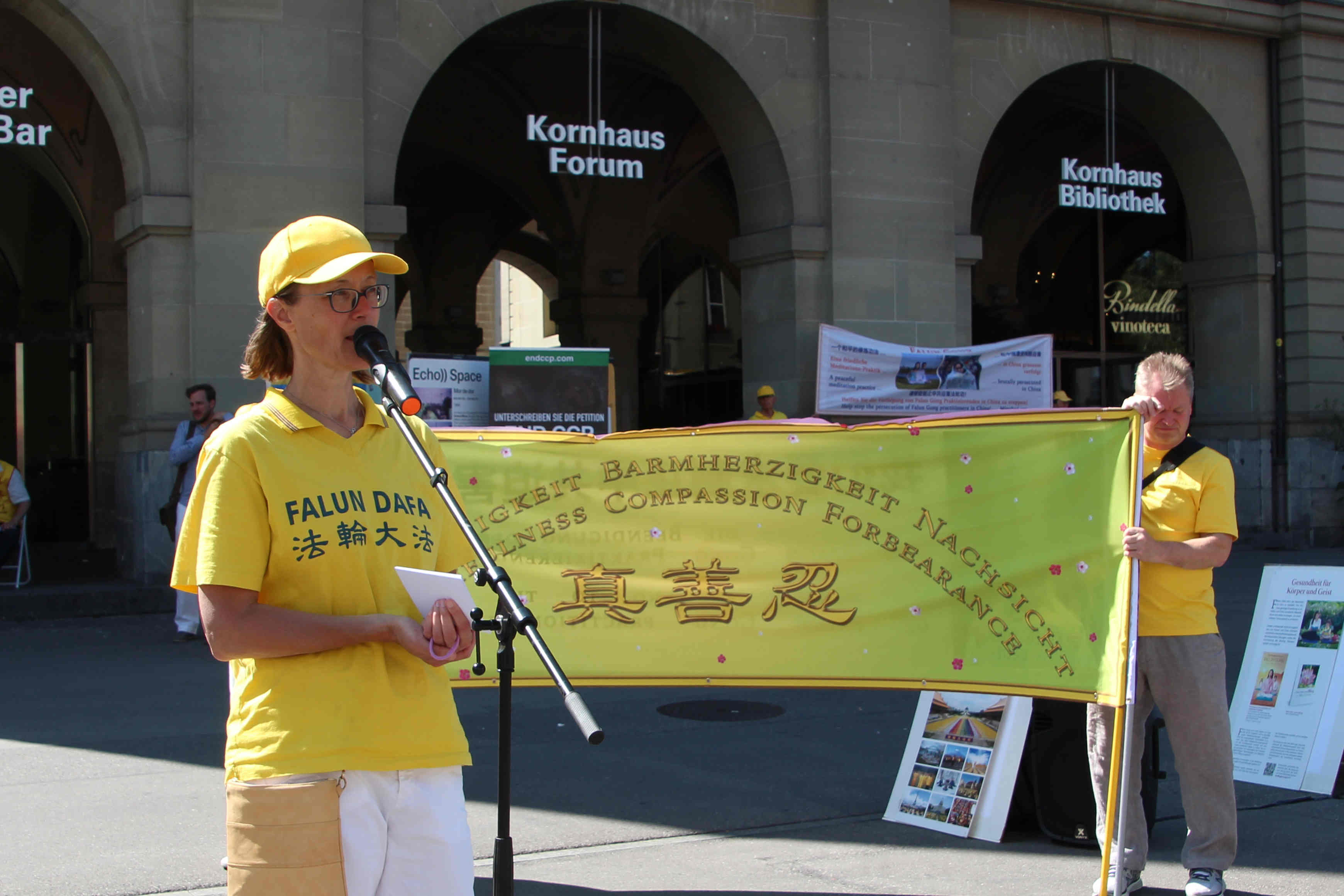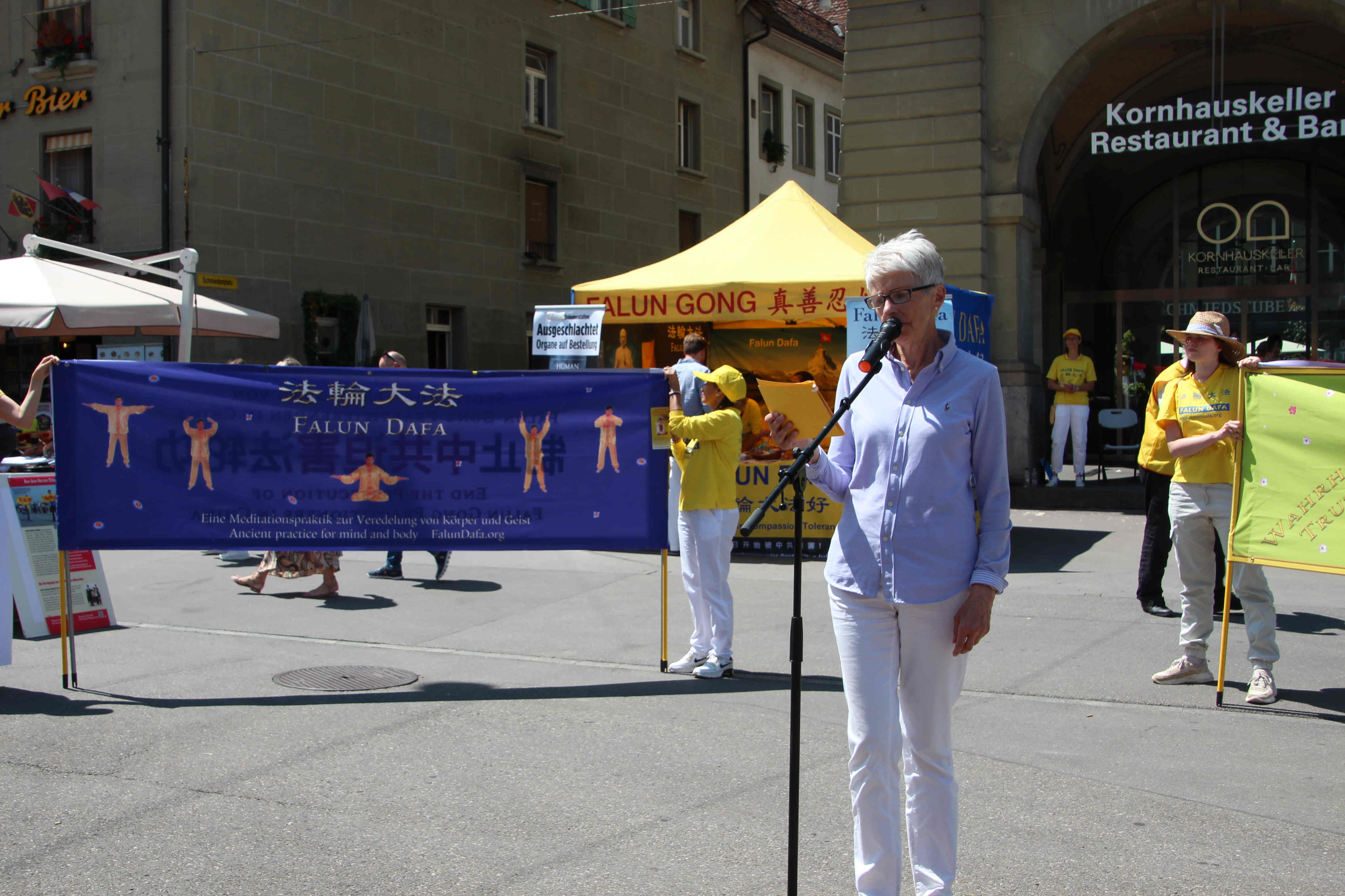 下午在伯尔尼市中心的控豪斯(Kornhaus)广场集会上,学员们再次通过功法演示、演讲及发送真相传单,告诉路人法轮功是什么,揭露中共迫害法轮功学员,特别是活摘法轮功学员器官的罪行。